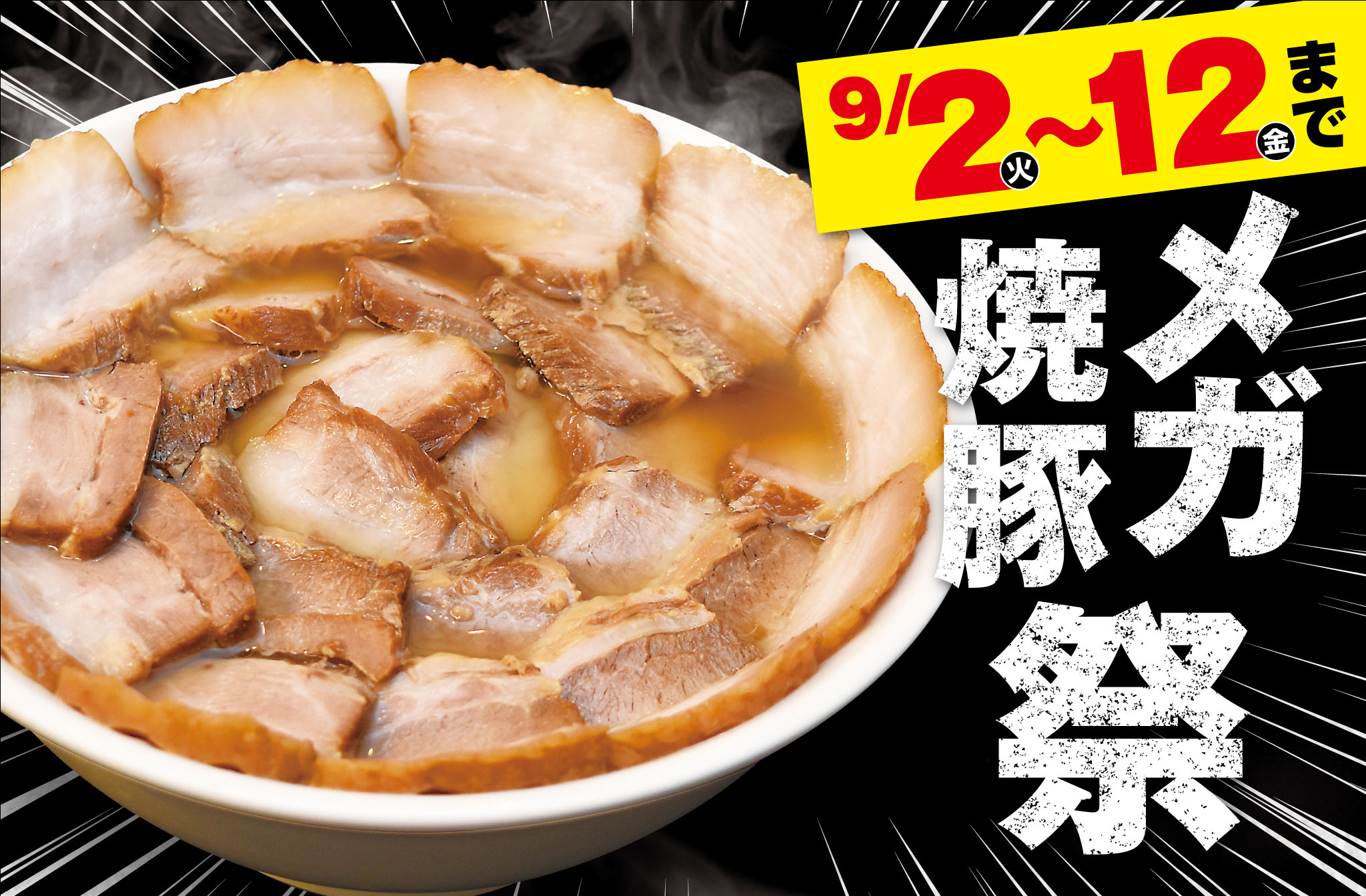 『メガ焼豚祭』2025年9月2日(火)~9月12日(金)開催 『メガ焼豚祭』の期間中、看板商品の「焼豚ラーメン」の焼豚をほぼ2倍の、23枚も豪快に盛り付けた「メガ焼豚ラーメン」が特別価格でお楽しみ頂けます。圧倒的なボリュ