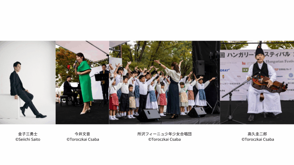 ハンガリー民族舞踊グループ 踊り部・東京まるる、民族音楽楽団 フォークアンサンブル チコーシュ、ハンガリー伝統楽器テケレー奏者 高久圭二郎、オペラ歌手 今井文音、ピアニスト 島貫愛、ハンガリー伝統楽器チテラ 若井花梨・フマギ高校(HUMAGI)、チェリスト 水野優也、合唱 所沢フィーニュ少年少女合唱団