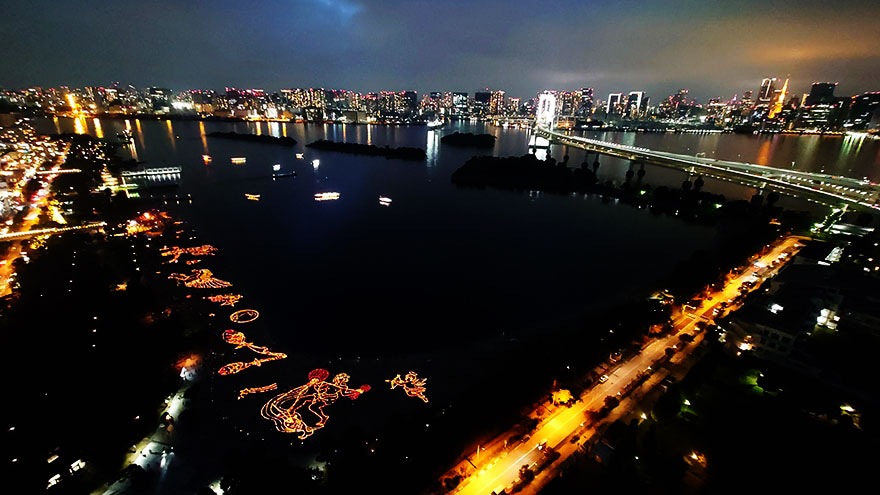「海の灯まつり」は、おだいばビーチに設置した1~2万個のペーパーランプをキャンドルの光で照らし、地上絵を描くイベントです。「海の灯まつり」の夜は、砂浜一面に揺らめくキャンドルの光とライトアップされたレインボーブリッジ、屋形船の色鮮やかな光が相まって、幻想的な雰囲気が体験できます。