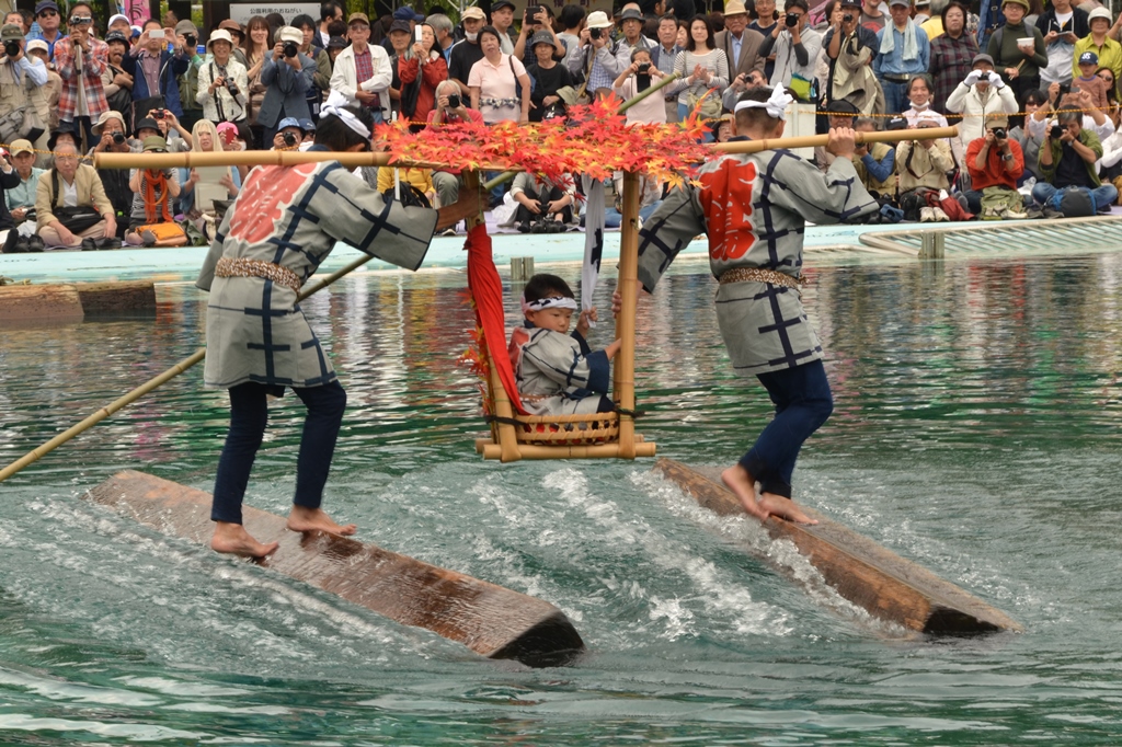 木場で材木を扱う川並の仕事の余技から発生しました。水に浮かべた角材に素足で乗り回転させる「地乗り」を基本に、数々の技術が加わり芸能として発達したものです。