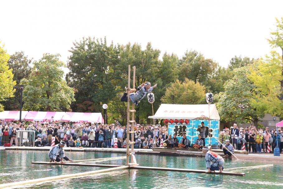 入口広場では「エコ環境ゾーン」や「NPO・市民活動コーナー」など多彩な催しが行われます。また、日曜日はイベント池で民俗芸能「木場の角乗」が披露されます。伝統の技で、大勢の観衆をドッと沸かせます!