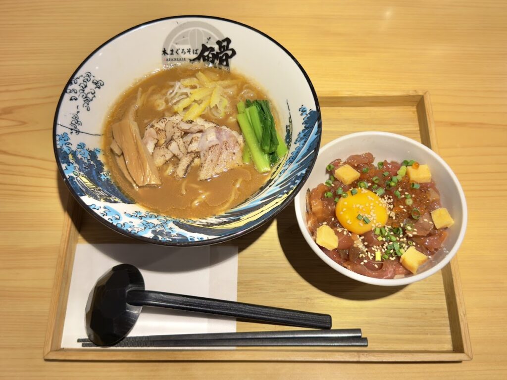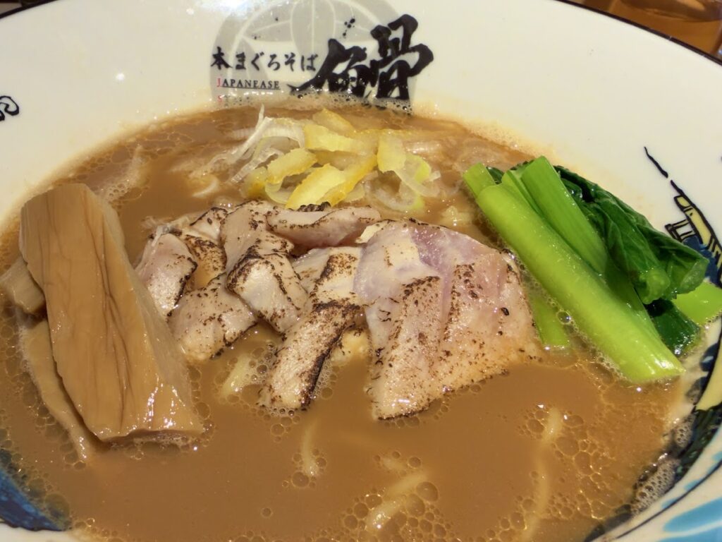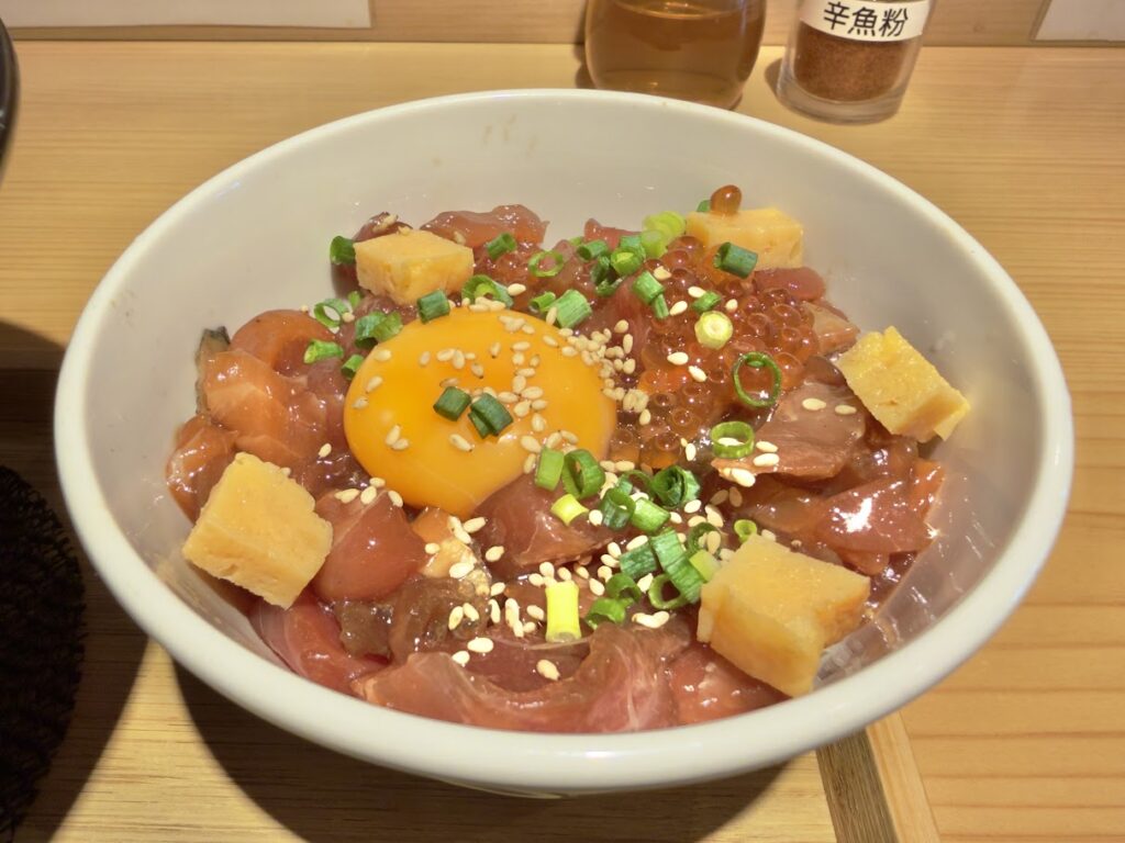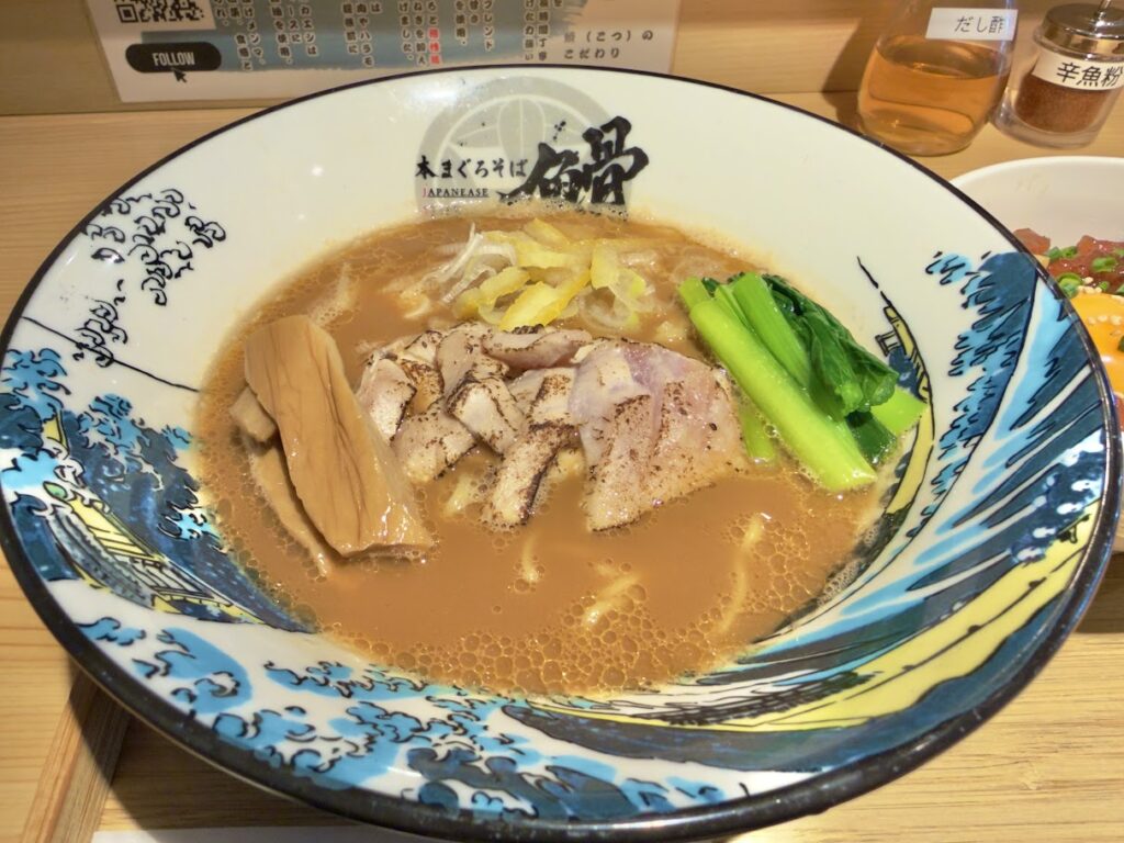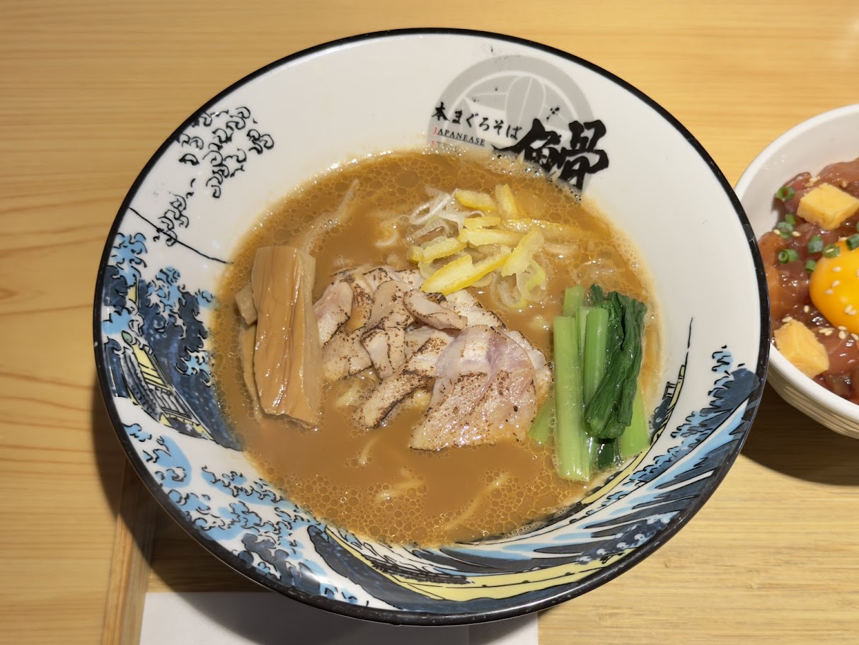 豊洲・本まぐろそば 䱻「金目鯛の中華そば」 グルメ 2025.10.10 豊洲だけの極み出汁! 本まぐろそば 䱻(豊洲6-5-1)金目鯛の中華そば(1080円)ちょこ丼セット(700円) 本まぐろラーメンが売りのお店ですが、今回は金目鯛の旨味たっぷりの季節限定メニューを注文!金目鯛のスープに香味油&特製の中華麺!セットのヅケ丼もねっとりまぐろとイクラで最の高です!
