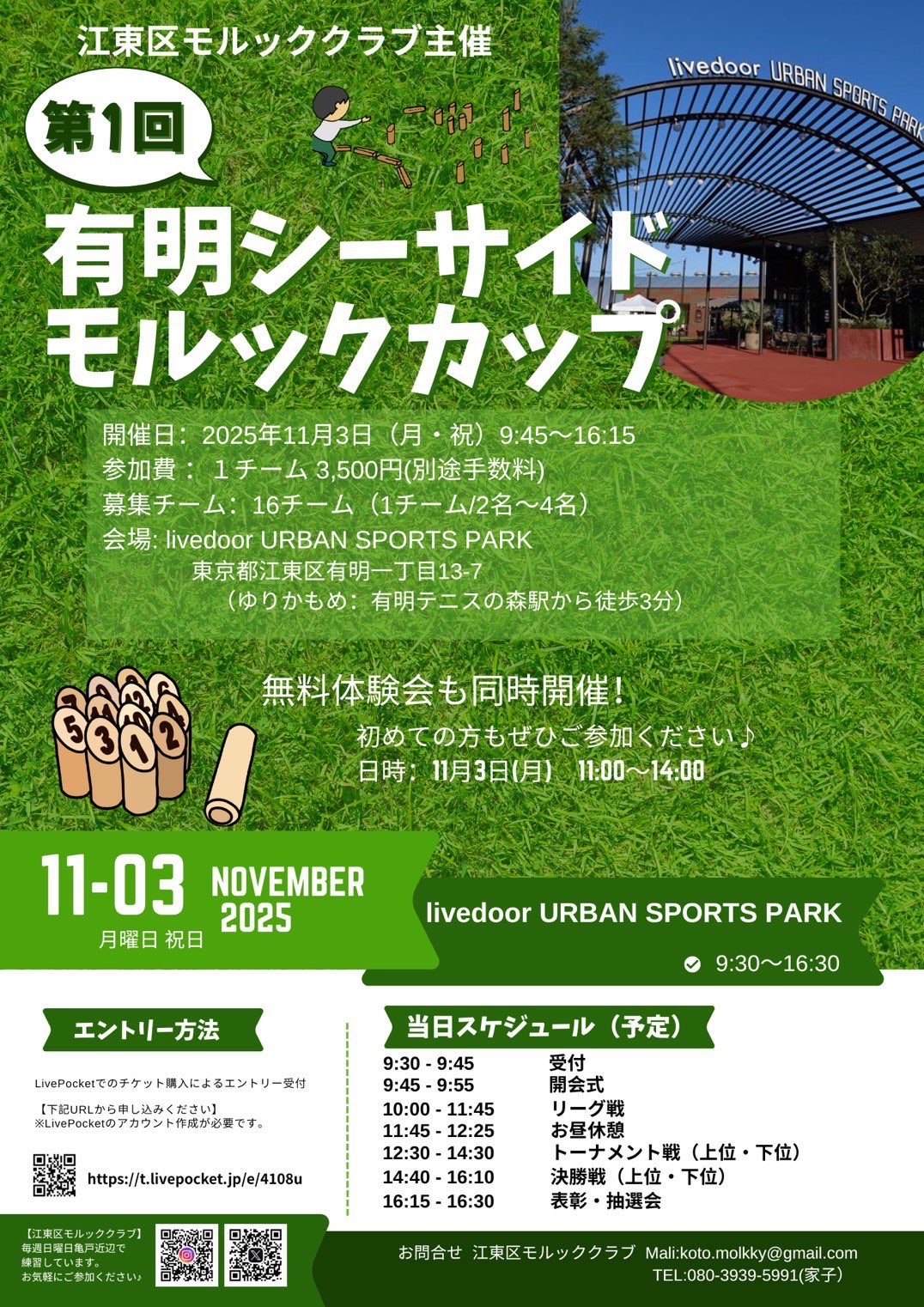 2025年11月3日(月・祝)、東京都江東区有明1-13-7 livedoor URBAN SPORTS PARKで、モルック大会イベント「第1回 有明シーサイドモルックカップ」が開催予定です。