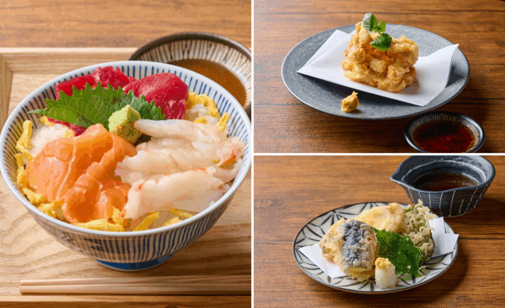 海鮮丼に、注文を受けてから揚げる熱々の「野菜天(3点)」または「鶏天」を組み合わせたセット(1,280円・税込)もご用意。その日の気分に合わせてお選びいただけます。