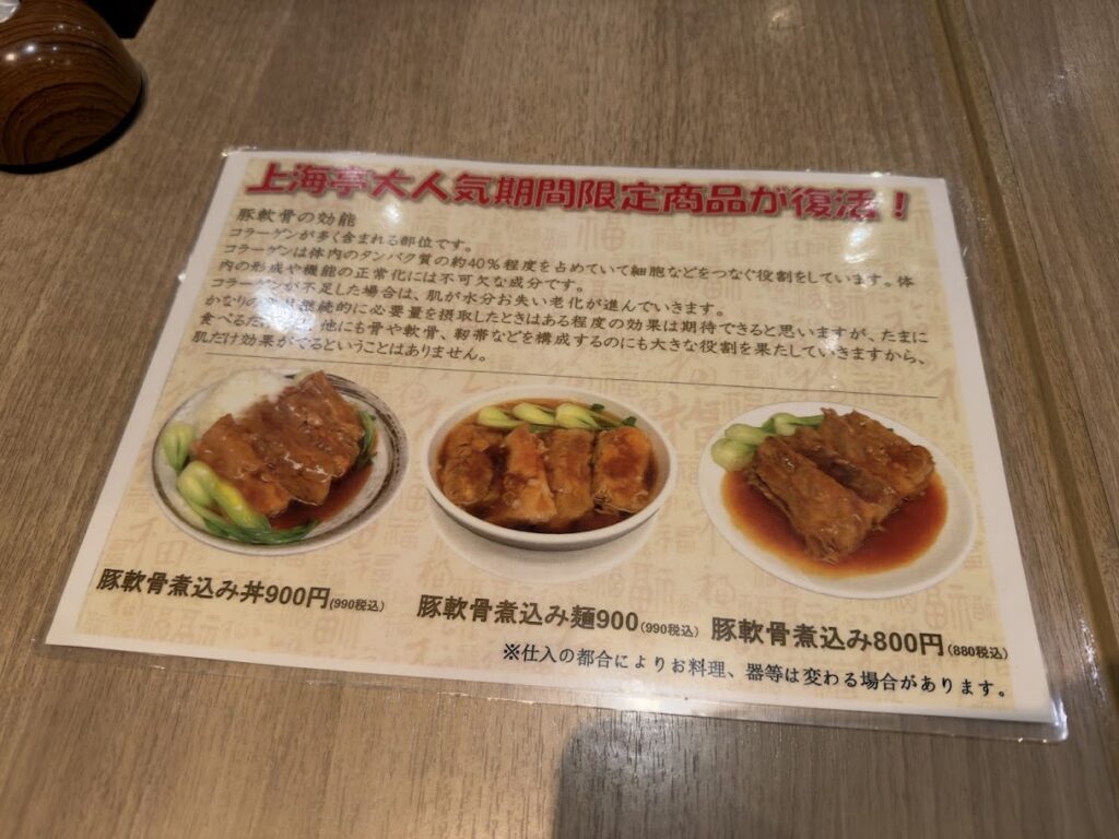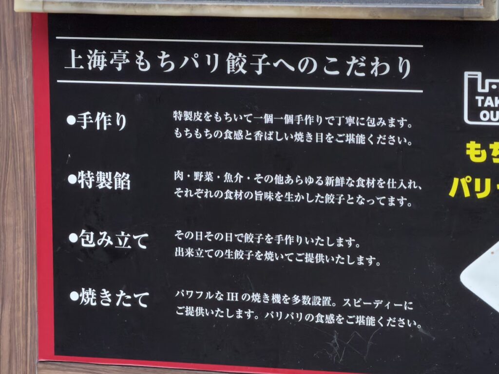 木場・上海亭 木場店「ダブル餃子セット」 グルメ 2025.10.252025.10.27 特製皮使用の手作り餃子がウマイ! 上海亭 木場店(木場5-2-5)ダブル餃子セット(800円) 休日昼に市販品より少しだけ上を行く餃子を大量にパクつきつつ、ハイボールをゴクゴクプハーと飲む目的にビッタシ合致します!なにやら人気らしい「豚軟骨煮込み」が大変美味しそうだったので次回の課題とする!