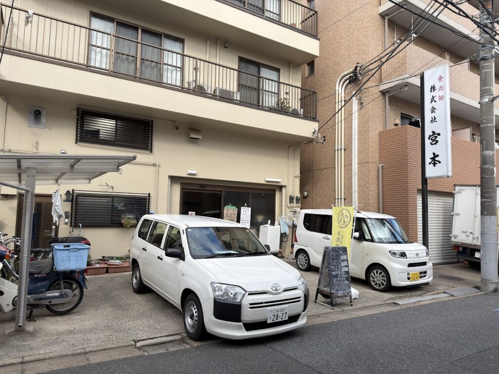 路地に入って左手に、株式会社宮本の看板、そして立て看板がある駐車スペースの奥に作業所があり、直売は、その入口あたりで対応してくれます。作業所の中には入れませんのでご注意を。