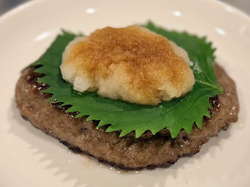 じっくり焼いて、おろしポン酢で食べてみました。ハンバーグは、解凍前後は平たい円形ですが、焼くと小判型になります。