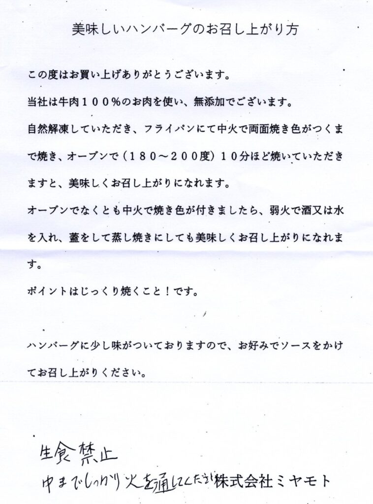 直売対応してくれた方が「焼き方についてはー」と言ってくれたので、「何かあったらください!」と言って、「おいしいハンバーグのお召し上がり方」の紙をもらってきました。ひゃっほい。