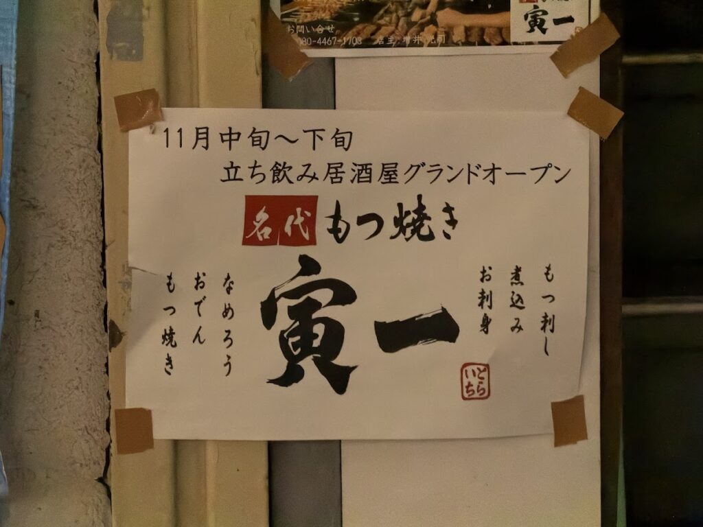 亀戸駅近くに立ち飲み居酒屋がオープンするよ。ネパールレストランがあったとこ。 NEWS 2025.10.29 2025年11月中旬~下旬、東京都江東区亀戸5-5-12に、立ち飲み居酒屋「名代 もつ焼き 寅一 亀戸店」がオープン予定です。