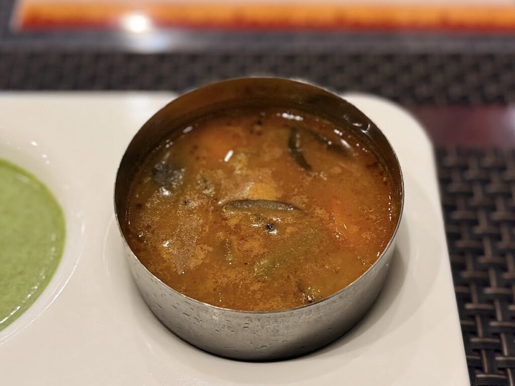 豆(トゥールダル)と野菜(オクラ、にんじん、ナスなど)を煮込んだスープカレー風の付け合わせ。スパイスと酸味の効いた風味で、ドーサを浸して食べるのが一般的です。