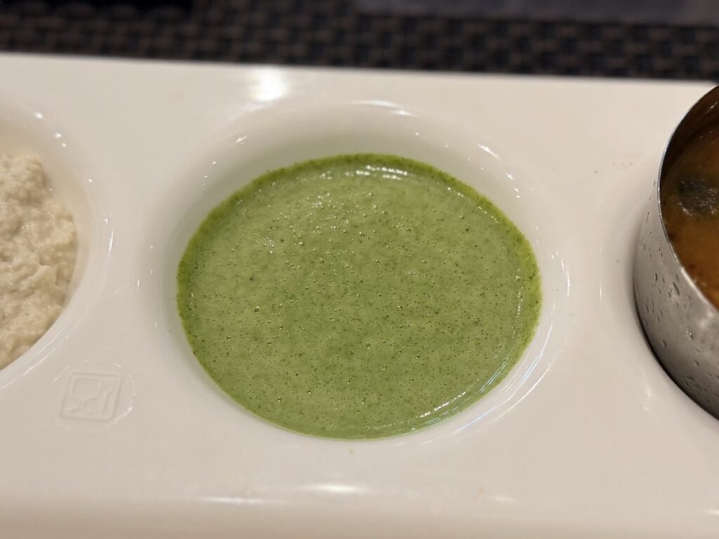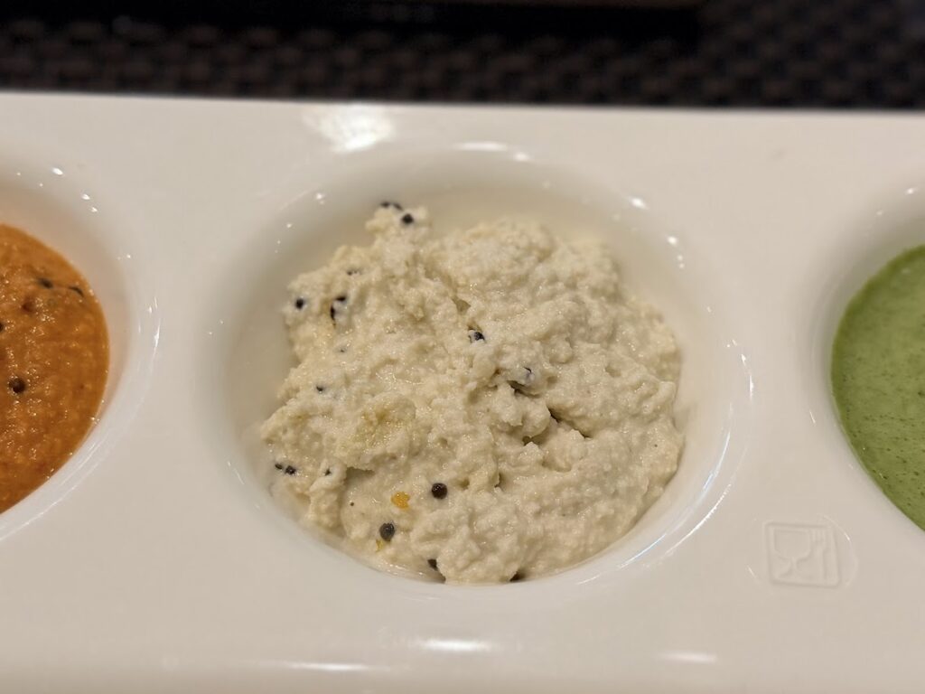ミント、コリアンダー(香菜)、青唐辛子、レモン汁などをブレンドしています。清涼感があり、油分の多いドーサをさっぱりと食べられる役割です。