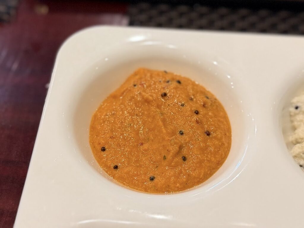 トマト、赤唐辛子、タマリンド(酸味のある果実)、マスタードシード、カレーリーフなどを炒めて作ります。酸味とピリッとした辛味が特徴で、ドーサにパンチを加えます。