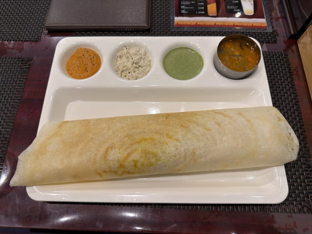 なので、南インド料理のベーシックな「マサラドーサ」をオーダーしました。こちら。このオリジナルトレイも大変よいですね。