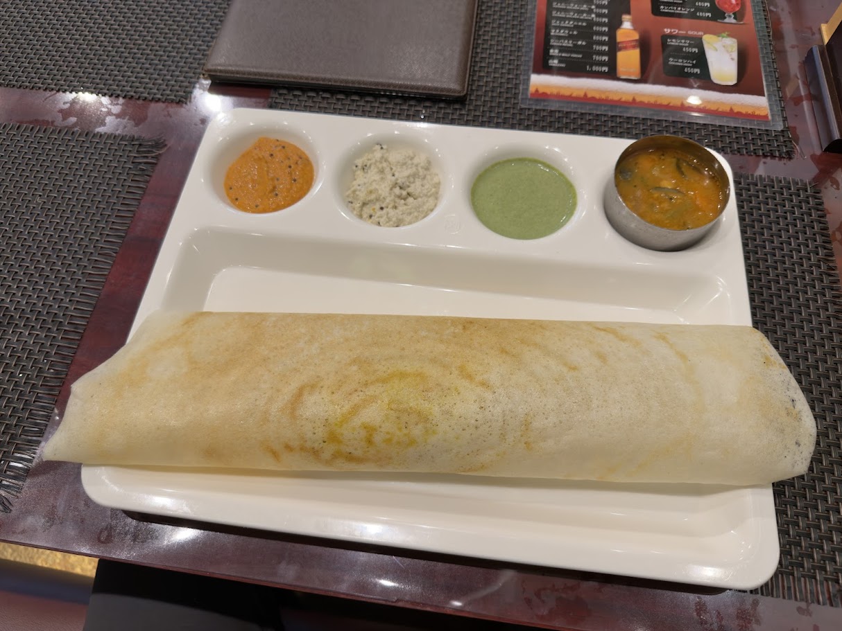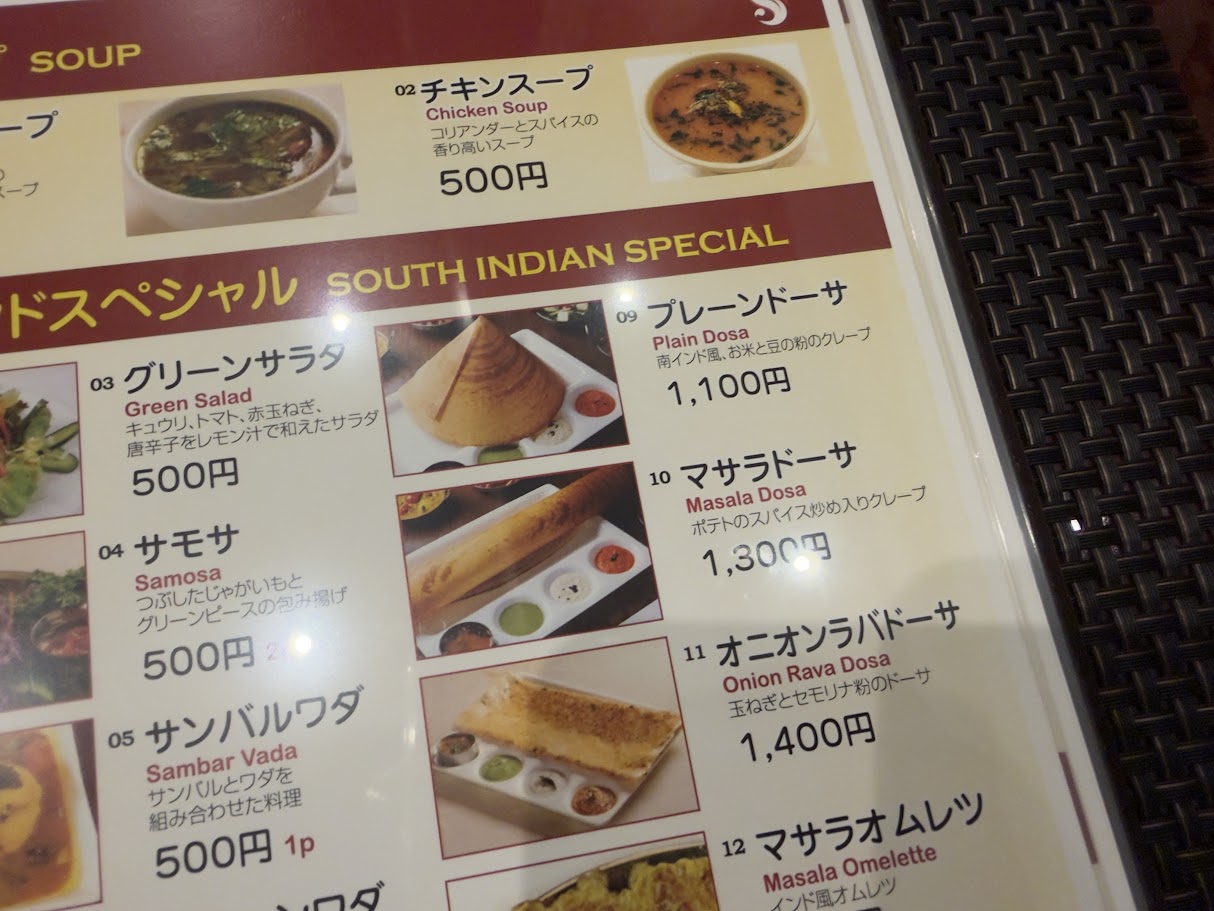 シリバラジは中目黒店と水道橋店があり、こちらの東陽町店が3店舗目。既存店ではドーサが6~8種類もあります。マサラフリークに人気の、ドーサの生地にまでマサラが練り込まれているためにドーサのサクサク感が犠牲になっているほどマサラにこだわった「シリバラジスペシャルドーサ」目当てで行きましたが、東陽町店は3種類のみとのこと。