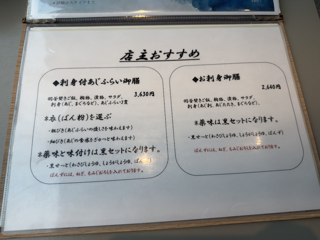 富岡・あじふらい てしお「刺身付あじふらい御膳」