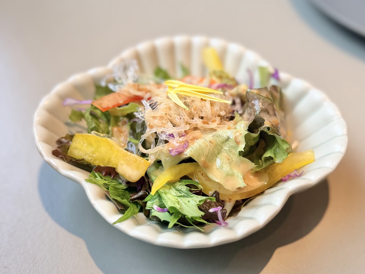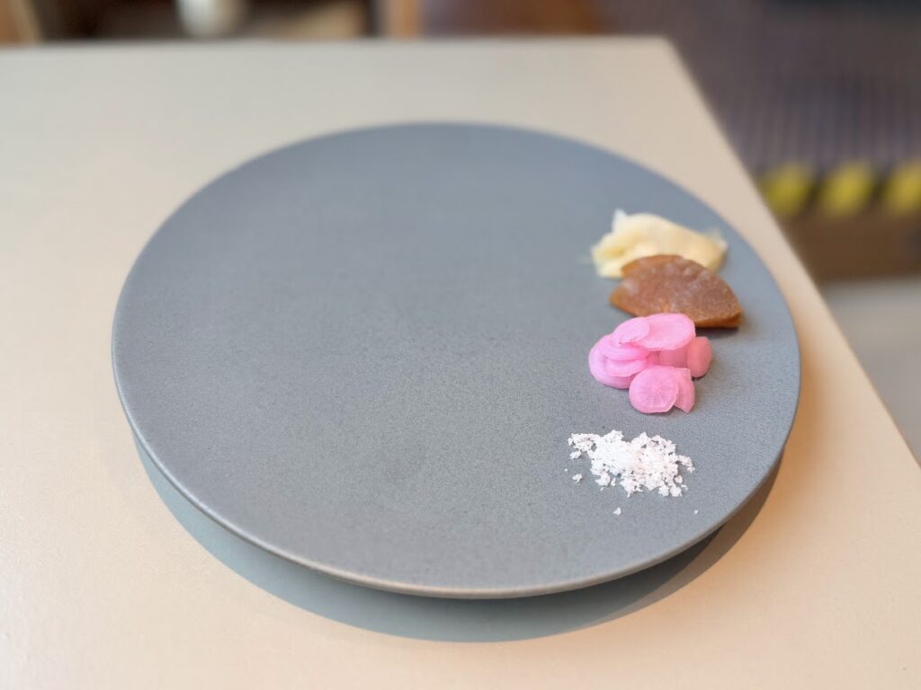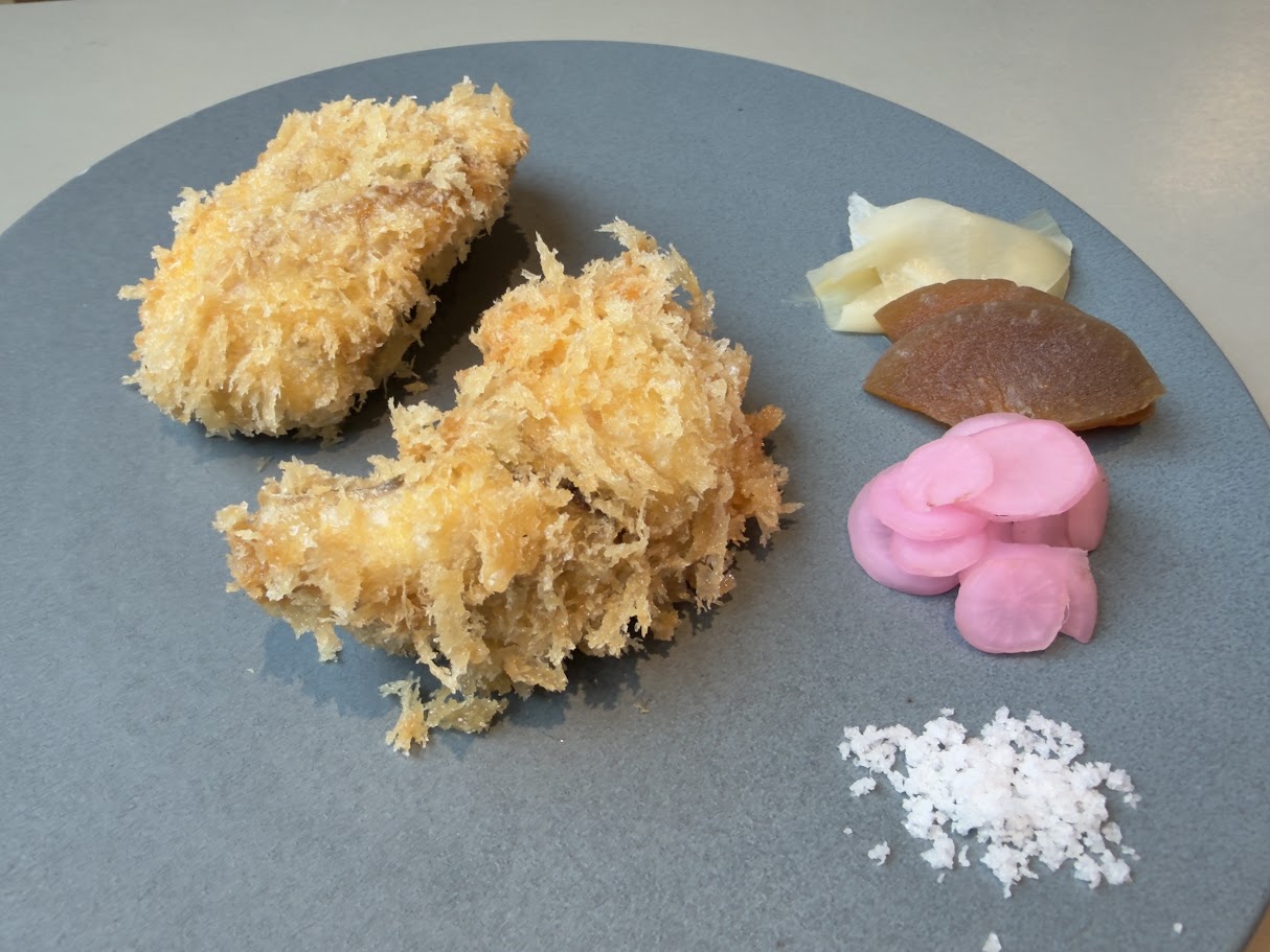 最初に、アペタイザー的サラダと共に、これから揚げたてのアジフライが逐次ランディングしていく平皿が供されます。今日の平皿には、ガリ、奈良漬け、桜大根、そしてお塩が載っていました。