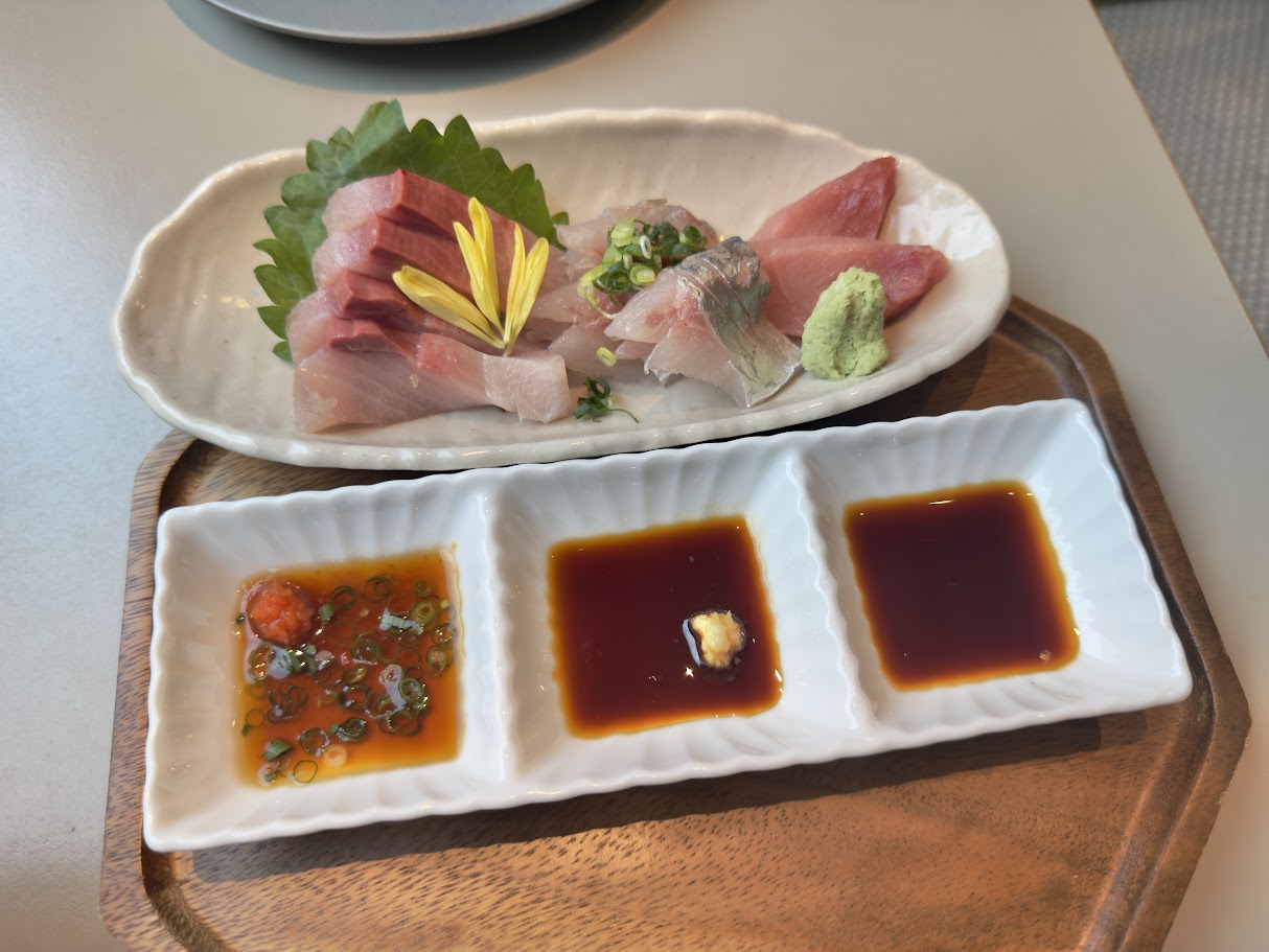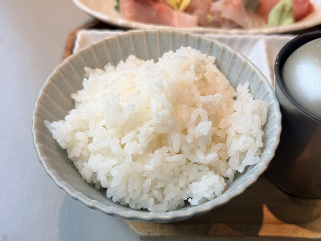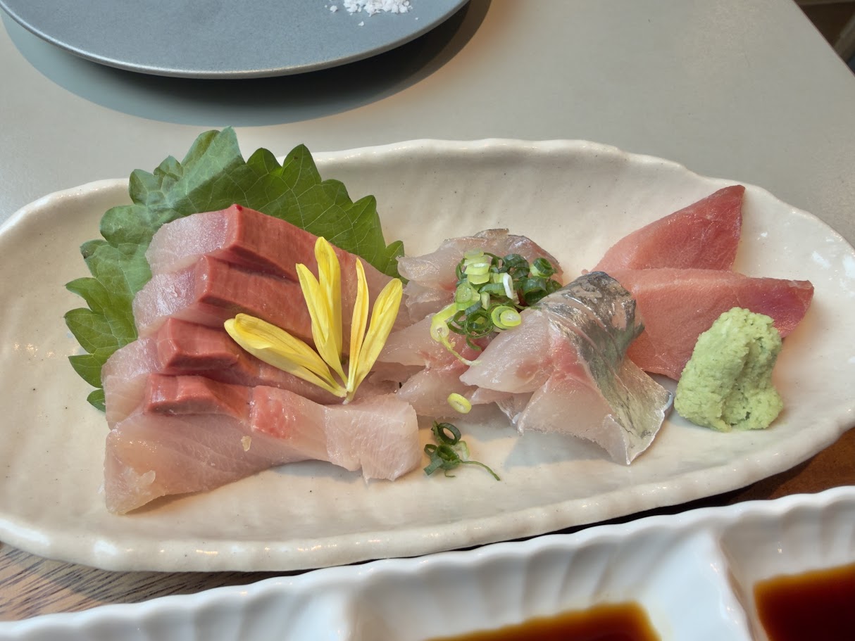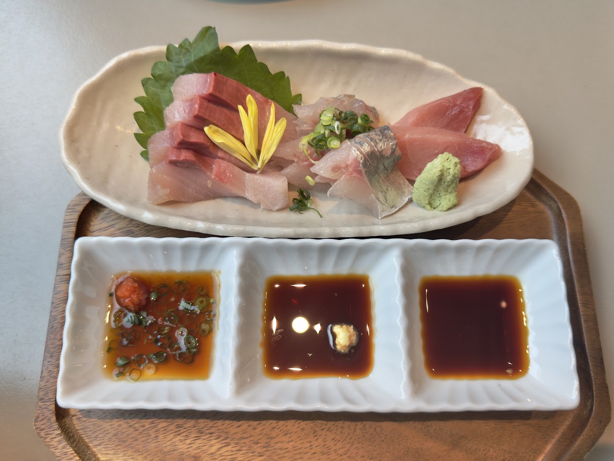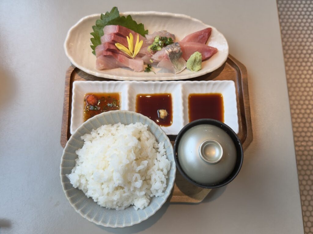 まず、お造りとご飯セットが出てきました。今日の刺身は、左から、イナダ、アジ、マグロ。
