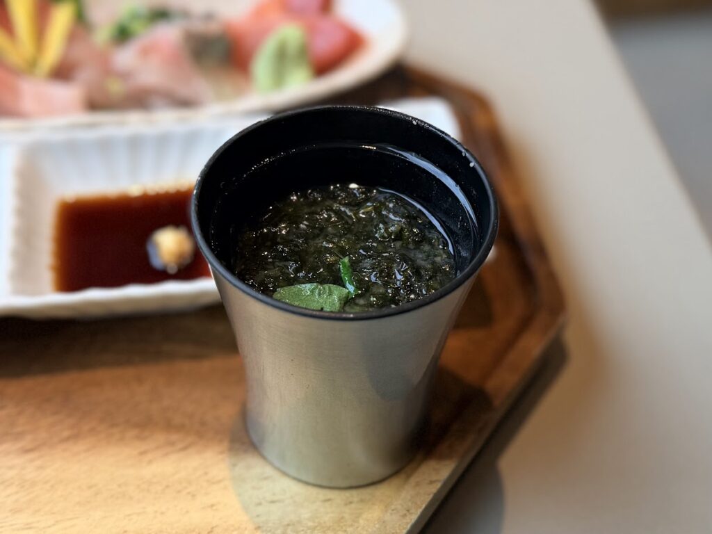 薬味は黒セットで、左から、ネギともみじおろしの入ったポン酢、真ん中が生姜醤油、右がワサビを使う際の醤油です。
