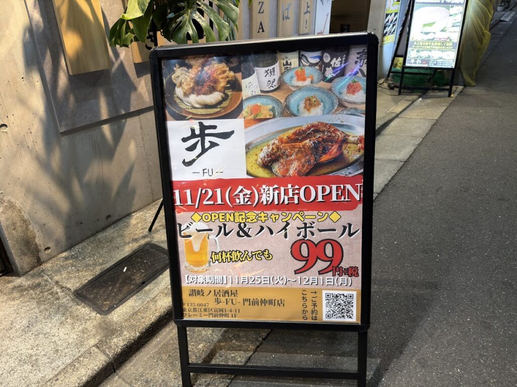 富岡に讃岐系の居酒屋がオープンしたよ。もつ膳のあったとこ。 新店舗 2025.11.212025.11.30 2025年11月21日(金)、東京都江東区富岡1-4-11に、居酒屋「讃岐ノ居酒屋 歩-FU- 門前仲町店」がオープンしました。 おめでとうございます!
