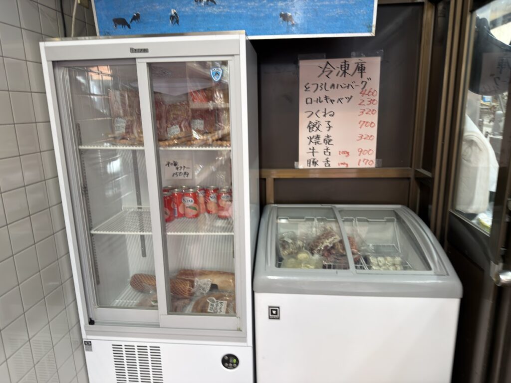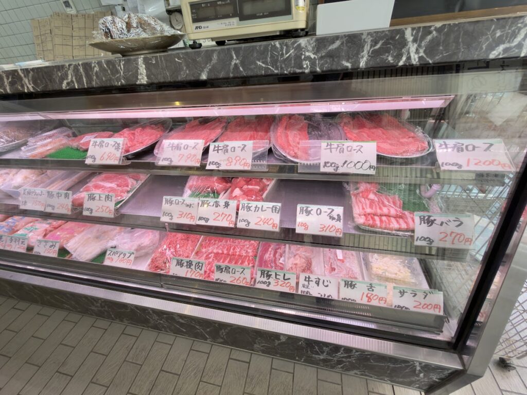 店内のショーケースに収められている商品は、結構なバリエーションがあります。チキンソテー、中華くらげ、牛たん、合鴨、幻ろしのハンバーグ、ローストビーフ、ミートボール、味噌漬、豚もつ、つくね、シュウマイ、豚レバー、豚味付ホルモン、粗挽きウィンナー、桑原ハム、天狗ハム、桑原ベーコン、天狗ベーコン、鶏もも肉、鶏むね、手羽先、ささみ、牛肩ロース、豚中肉、豚上肉、豚ロース、豚赤身、豚カレー用、豚バラ、スペアリブ、豚挽肉、豚肩ロース、豚ヒレ、牛すじ、豚舌、サラダ、などなど。