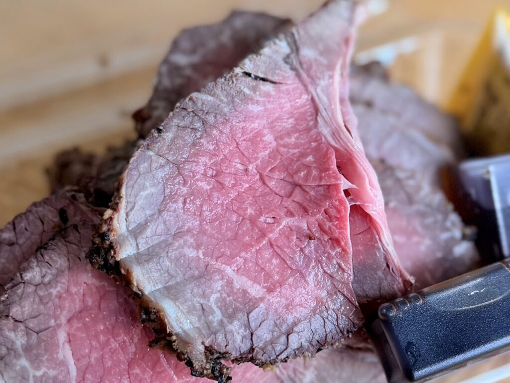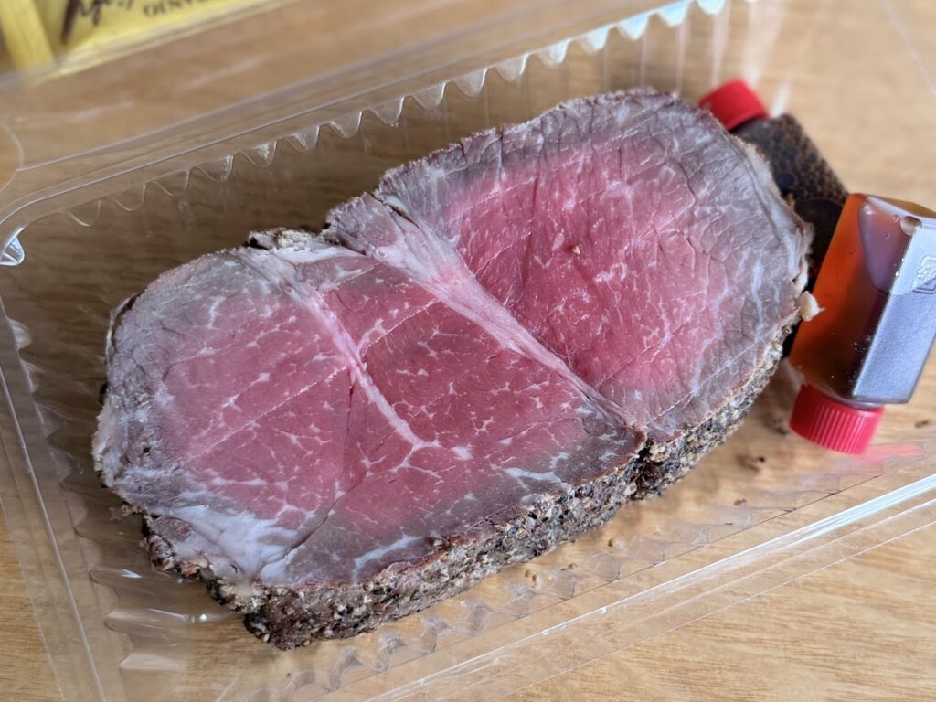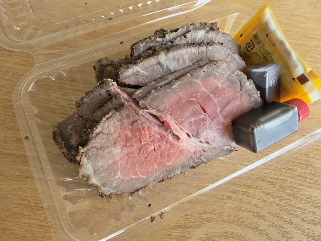 さて、今回購入したのはA5黒毛和牛ももを使用した匠の味で人気の、ローストビーフ(1000円/100g)です。お店でスライスしてくれるのでお手軽です。もちろんブロックでも購入できます。