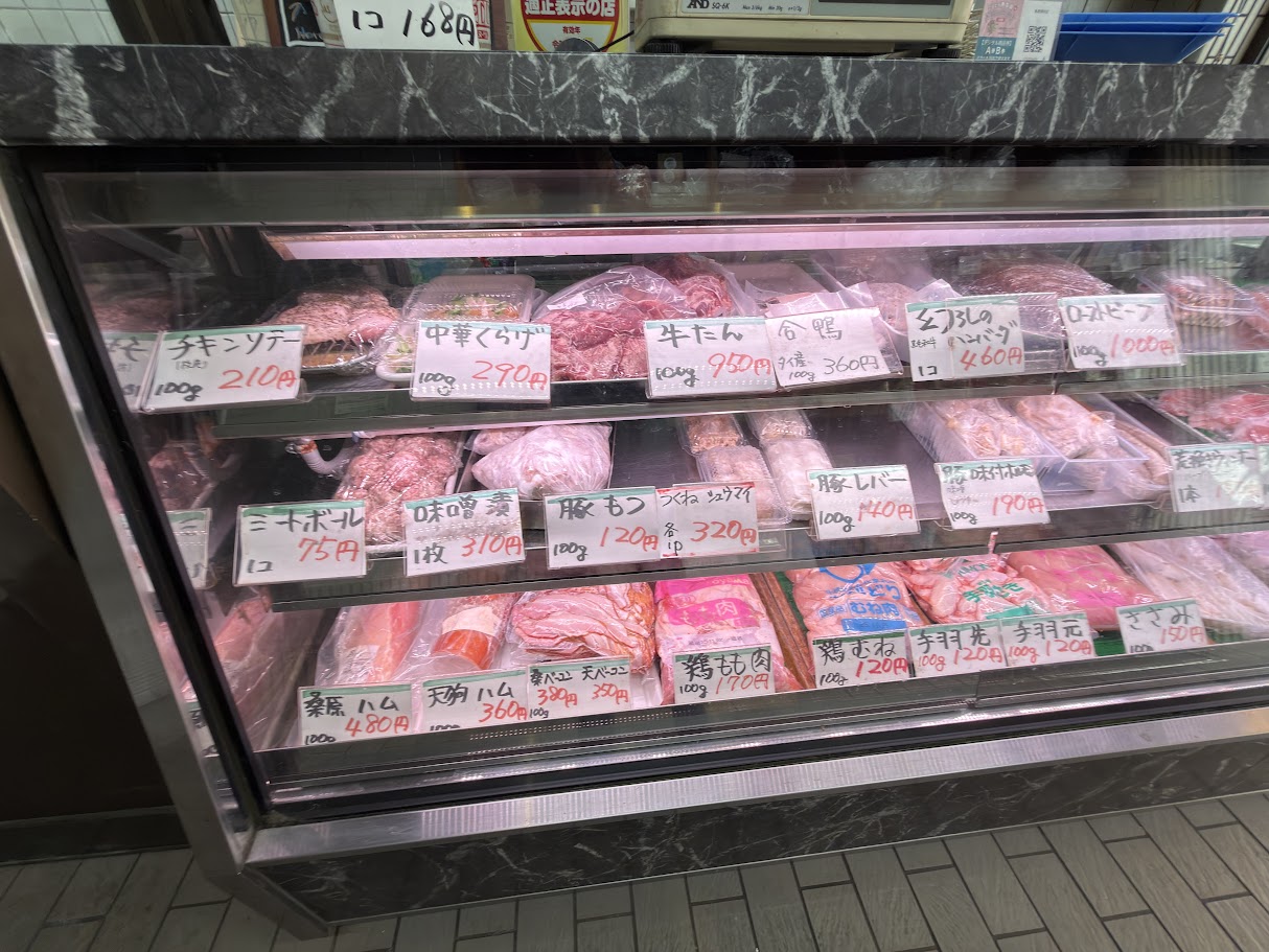 店内のショーケースに収められている商品は、結構なバリエーションがあります。チキンソテー、中華くらげ、牛たん、合鴨、幻ろしのハンバーグ、ローストビーフ、ミートボール、味噌漬、豚もつ、つくね、シュウマイ、豚レバー、豚味付ホルモン、粗挽きウィンナー、桑原ハム、天狗ハム、桑原ベーコン、天狗ベーコン、鶏もも肉、鶏むね、手羽先、ささみ、牛肩ロース、豚中肉、豚上肉、豚ロース、豚赤身、豚カレー用、豚バラ、スペアリブ、豚挽肉、豚肩ロース、豚ヒレ、牛すじ、豚舌、サラダ、などなど。