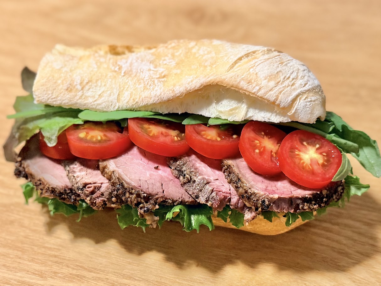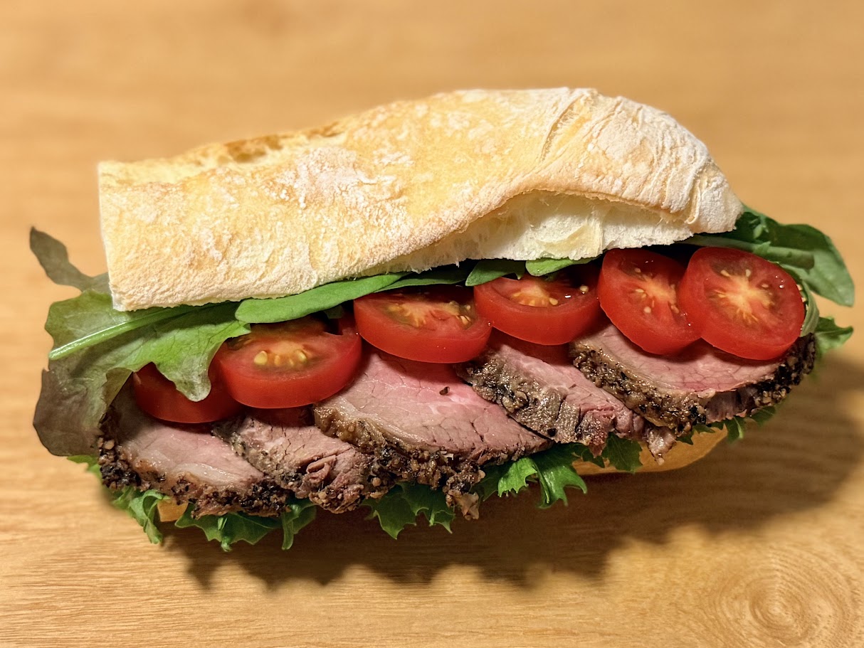 でもって、ローストビーフサンドを作ってみました。パンは、昨日11月18日(火)にグランドオープンしたばかりのGandia Bakery(北砂4-5-7)のチャバタを使用しました。プレオープンの時にもチャバタを購入しましたが、皮がパリッとしていたので、これで肉々しいチャバタサンド作りたいなーと思ってたんです。