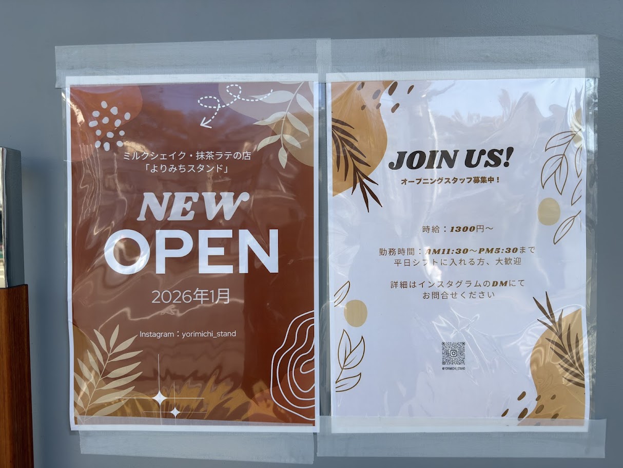 2026年1月、東京都江東区平野1-7-3に、ミルクシェイク・抹茶ラテのお店「よりみちスタンド」がオープン予定です。