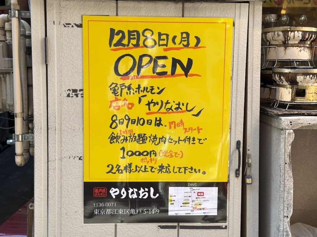 亀戸系ホルモンの新店はやりなおしらしいよ。 NEWS 2025.12.04 2025年12月8日(月)、東京都江東区亀戸5-14-9に、亀戸系ホルモンのお店「やりなおし」がオープン予定です。 何度でも蘇るさ!