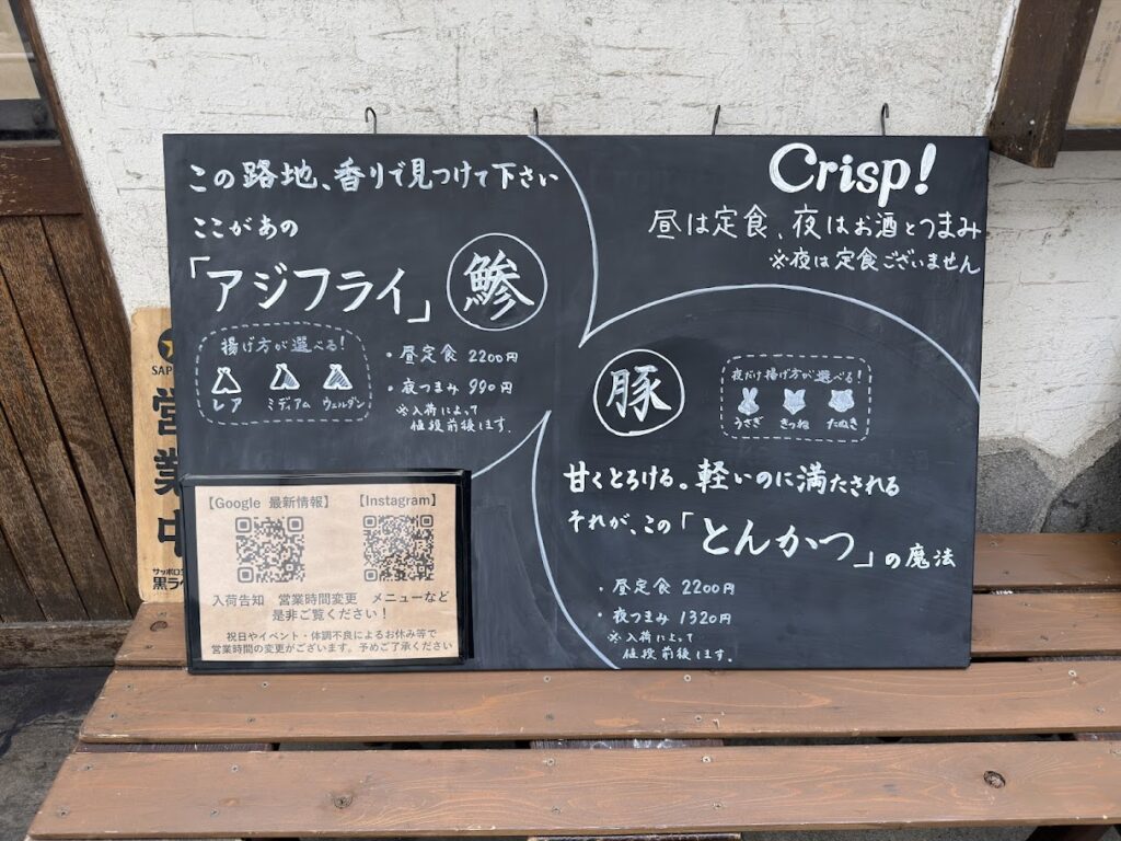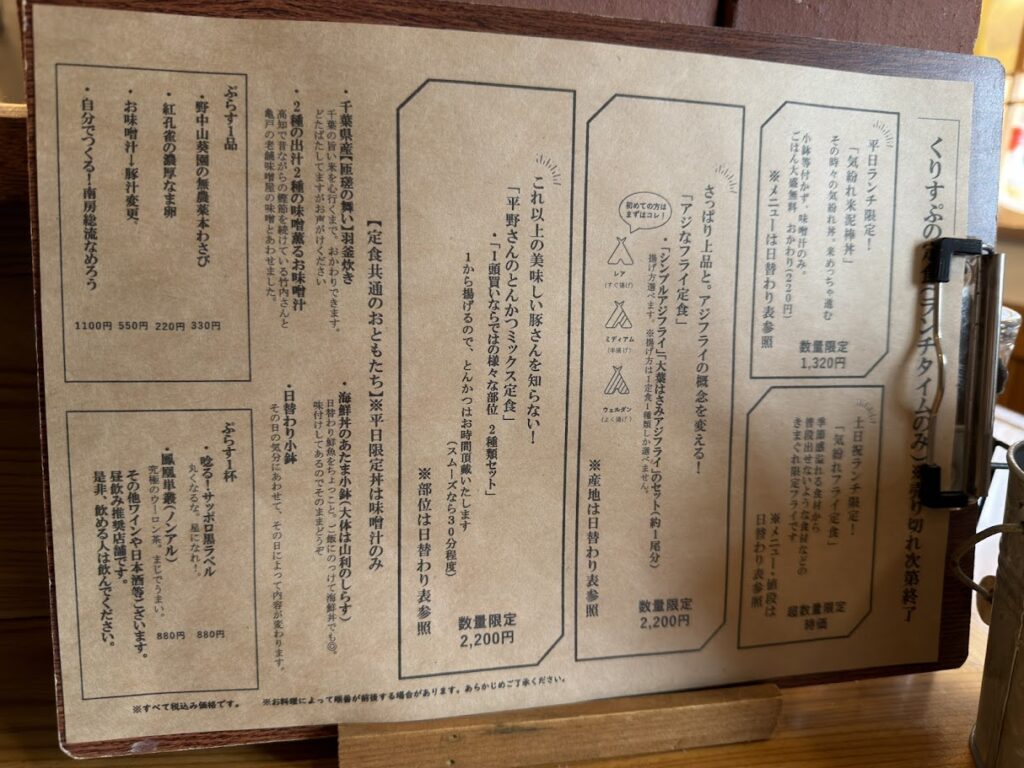 Crisp!のランチタイムメニューは「アジなフライ定食」(2200円)と「平野さんのとんかつミックス定食」(2200円)の2種類。
