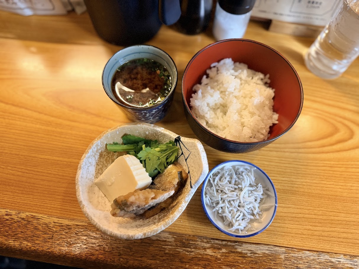 まずは、ご飯・お味噌汁・小鉢が運ばれてきます。内容は以下の通り。