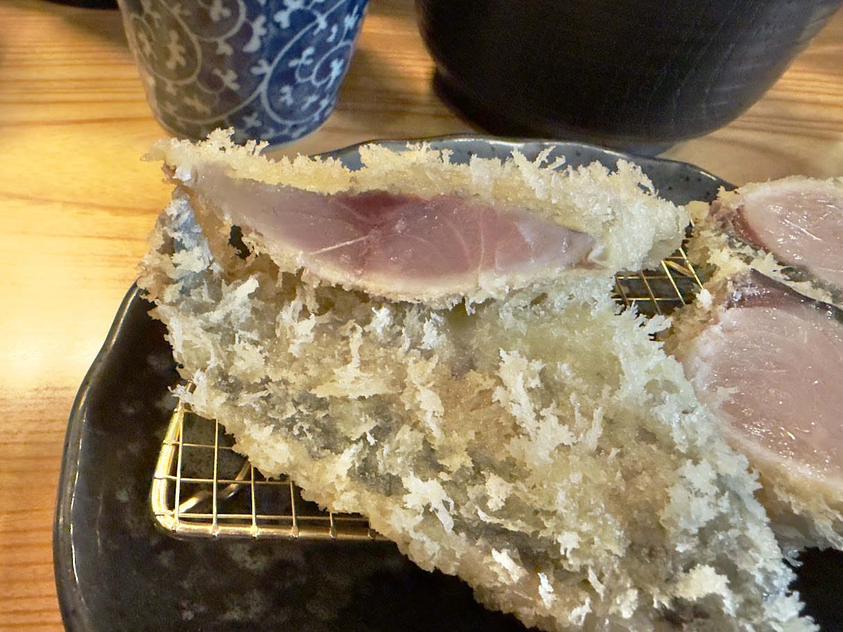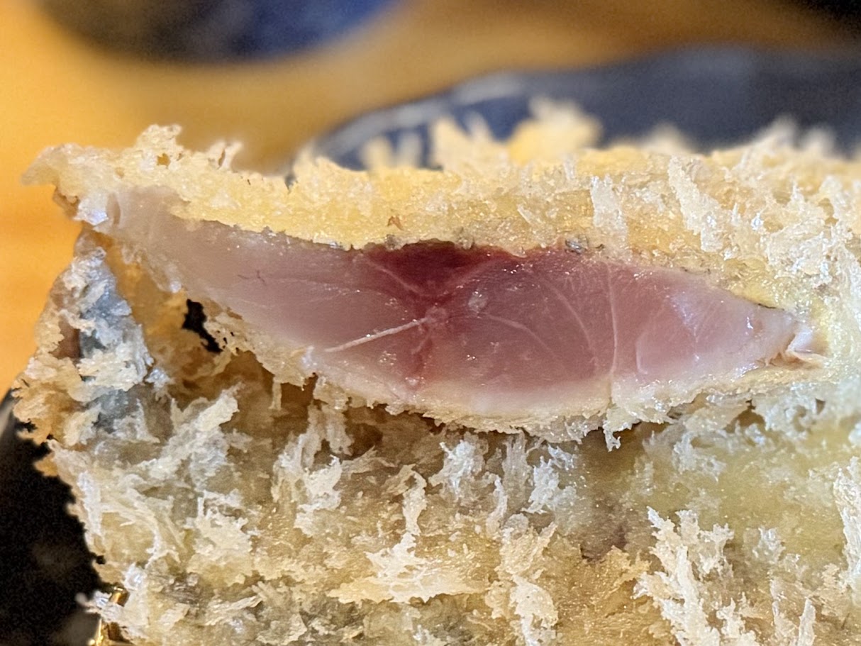 アジフライは、レア/ミディアム/ウェルダンの3段階から揚げ加減を選べるため、鰆のレアに合わせて、鯵もレアをお願いしました。