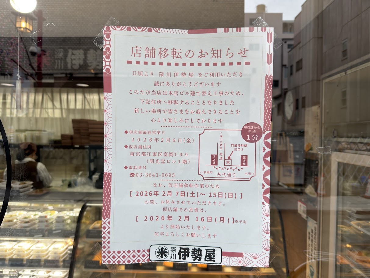 2026年2月16日(金)、東京都江東区富岡1-8-12の和菓子店「深川伊勢屋 本店」が、本店ビル建て替え工事のため、東京都江東区富岡1-9-9に仮店舗として移転オープン予定です。