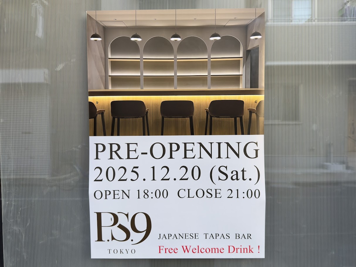 2025年12月20日(土)、東京都江東区扇橋2-7-5に、隠れ家的ジャパニーズ・タパス・バー「P.S.9」がプレオープン予定です。