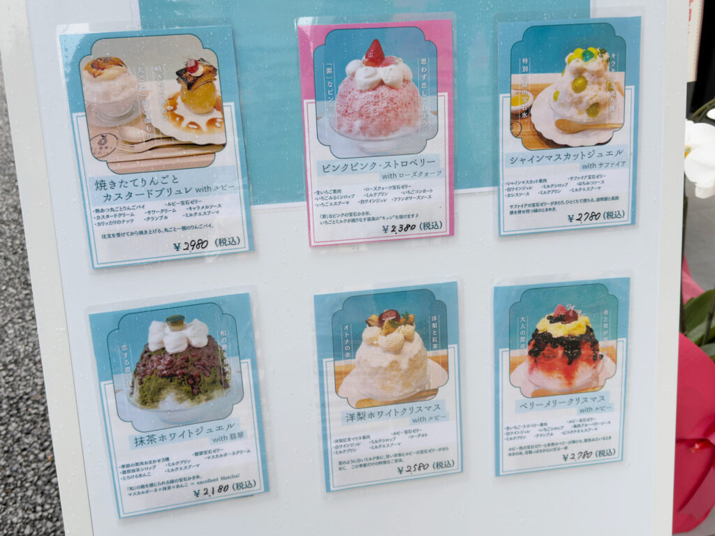 ・季節の果肉おまかせ3種 ・翡翠宝石ゼリー ・濃厚抹茶シロップ ・ミルクプリン ・マスカルポーネクリーム ・とろけるあんこ ・ミルクエスプーマ