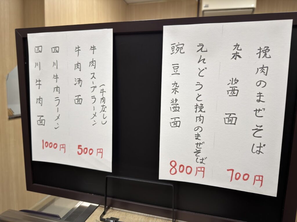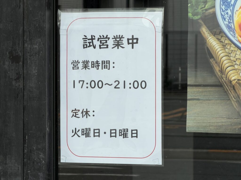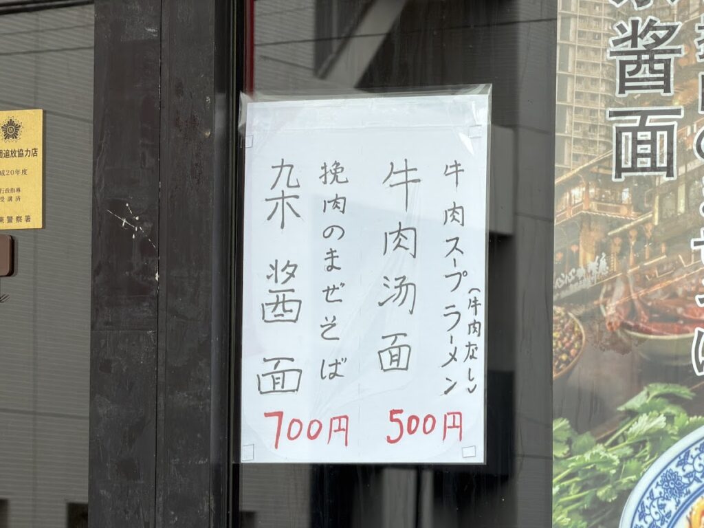 居酒屋こまや跡地に、なにやらお店が。店頭には「試営業中」の文字と、「牛肉汤面」と「杂醤面」の2種類のメニューの掲示のみ。ガチ中華の予感。