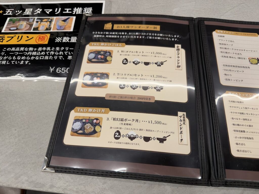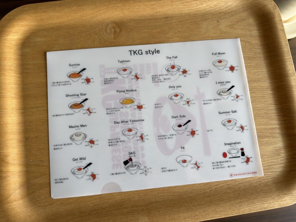 メインメニューはこちら。大きく分けて、「TKG 卵かけごはん」と「TKD 卵かけ丼」があります。それぞれ、好きな卵を2個選ぶのが基本みたい。「TKG 卵かけごはん」のトリプルセットは3つ選択。