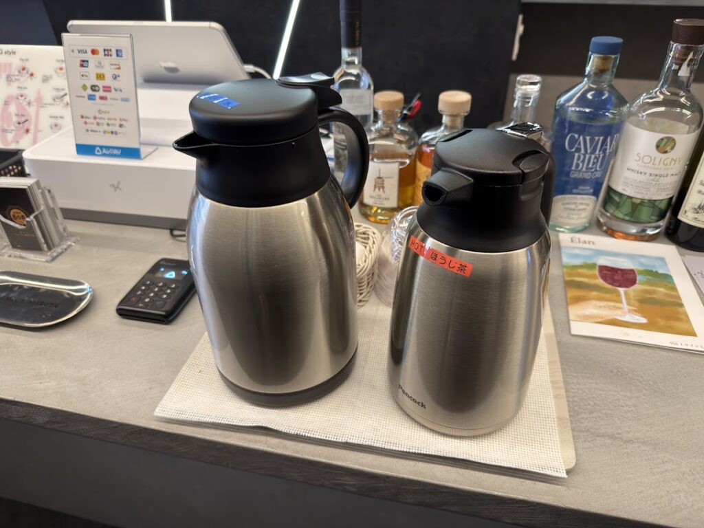 ほうじ茶(HOT)とお水はカウンター中央にあります。セルフでどうぞ。