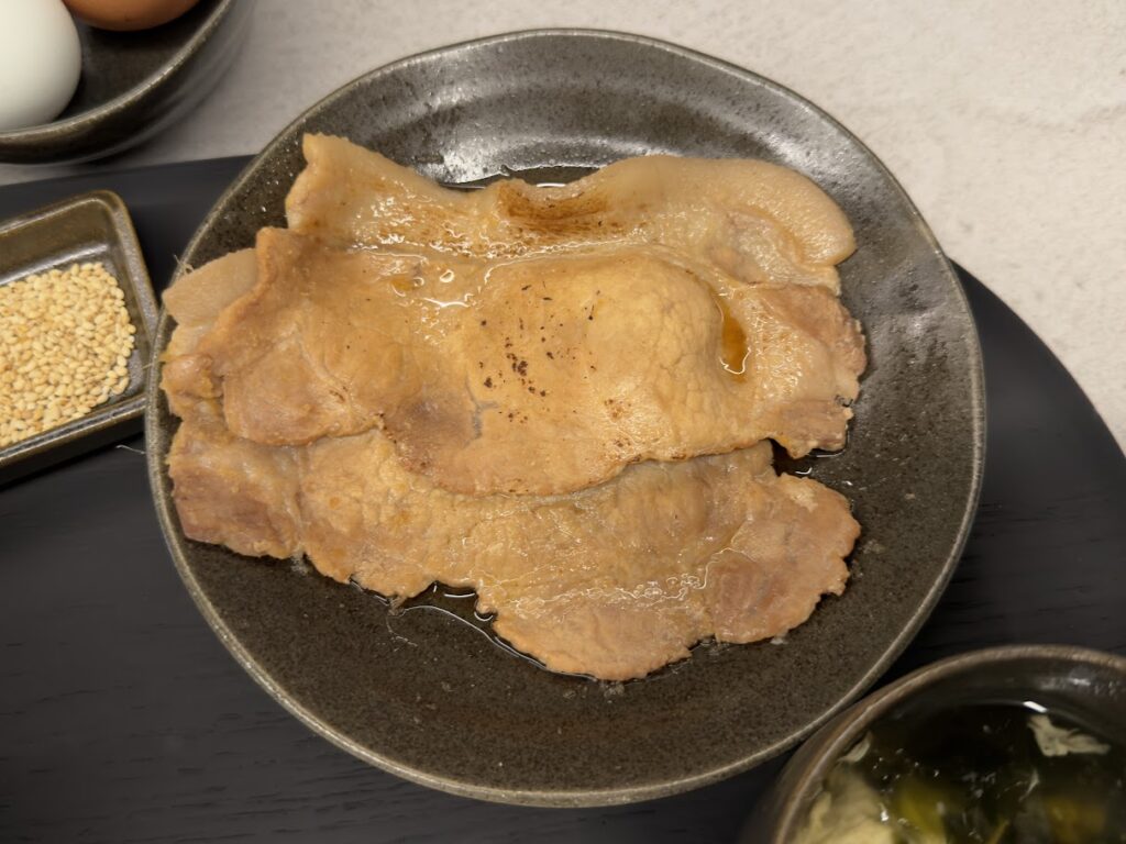 そして、初見ですが、TKD 卵かけ丼「柏幻霜ポーク丼」をオーダーしてみました。「柏幻霜ポーク」は、淡灰紅色の赤身にきれいなサシが入ったブランド豚肉のこと。店内でじっくり火を入れて生姜焼き風に味付けしてくれます。