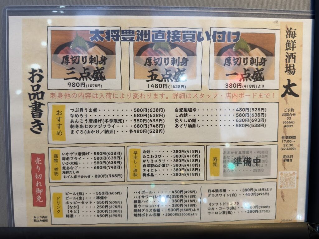 2026年1月8日(木)、東京都江東区千石2-9-2の、うどん店「西郷うどん」がリニューアルして、居酒屋「海鮮酒場 太」としてオープンしました。