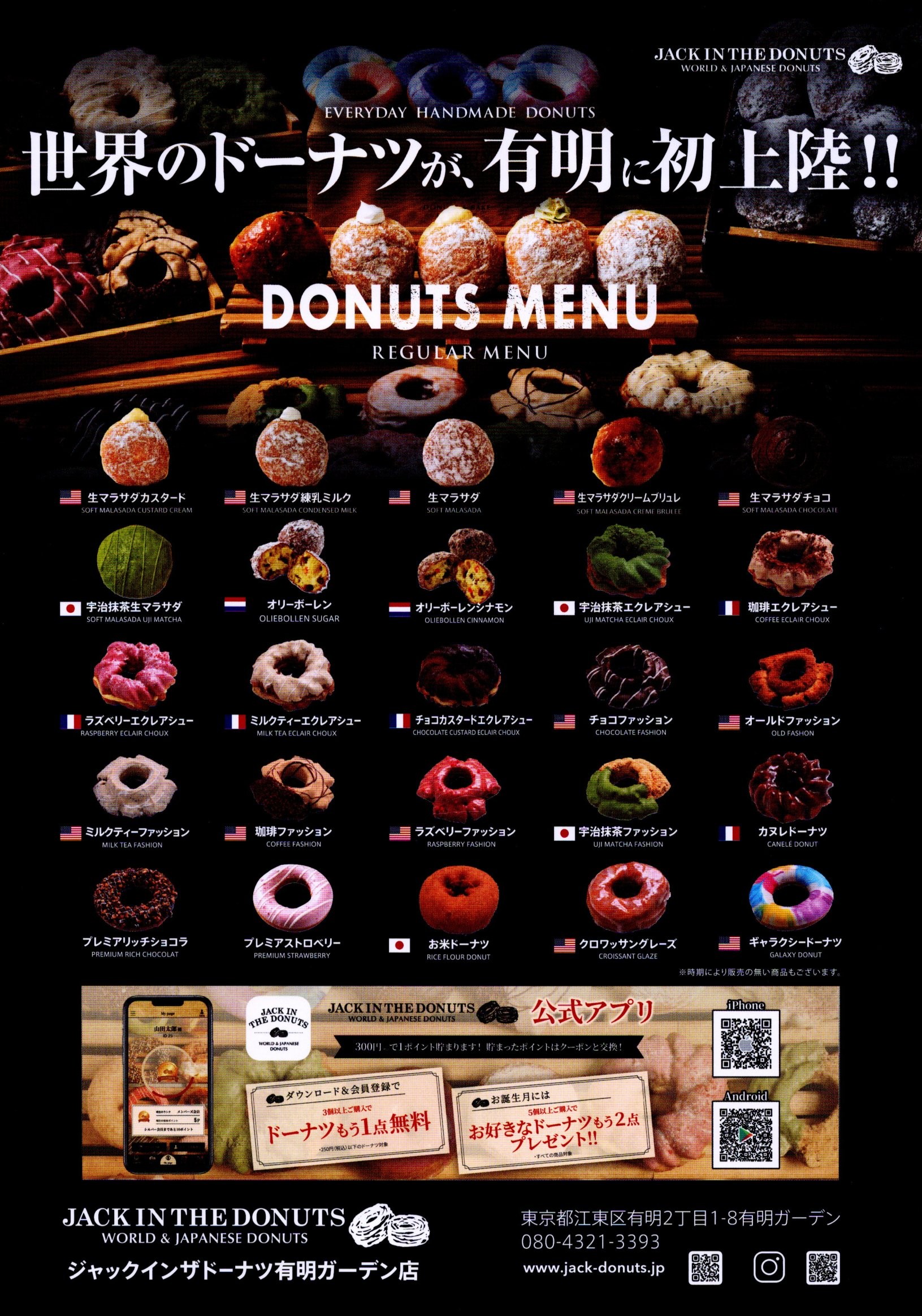 有明ガーデンにドーナツ専門店がオープンしたよ。 新店舗 2026.02.05 2026年2月5日(木)、東京都江東区有明2-1-8 有明ガーデン2Fに、ドーナツ専門店「JACK IN THE DONUTS 有明ガーデン店」がオープンしました。 おめでとうございます!
