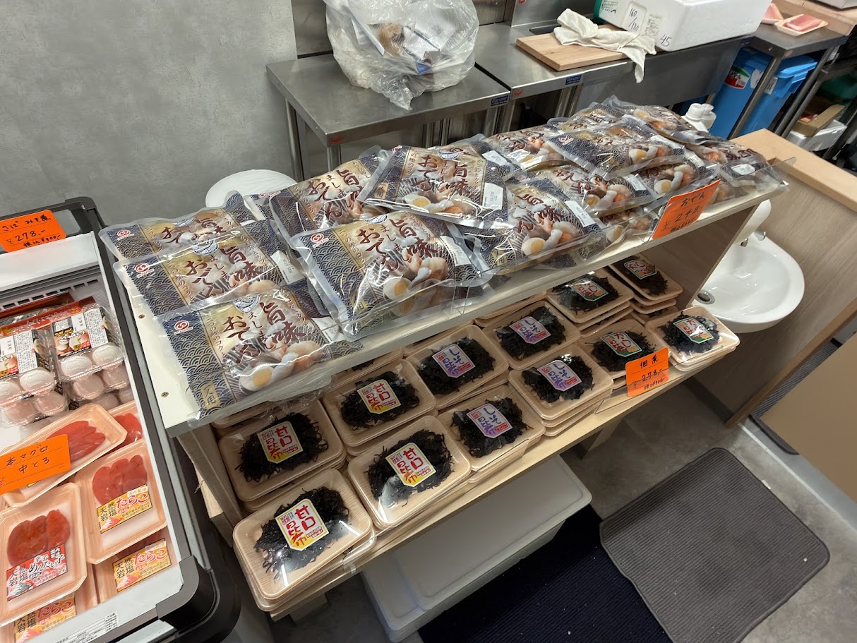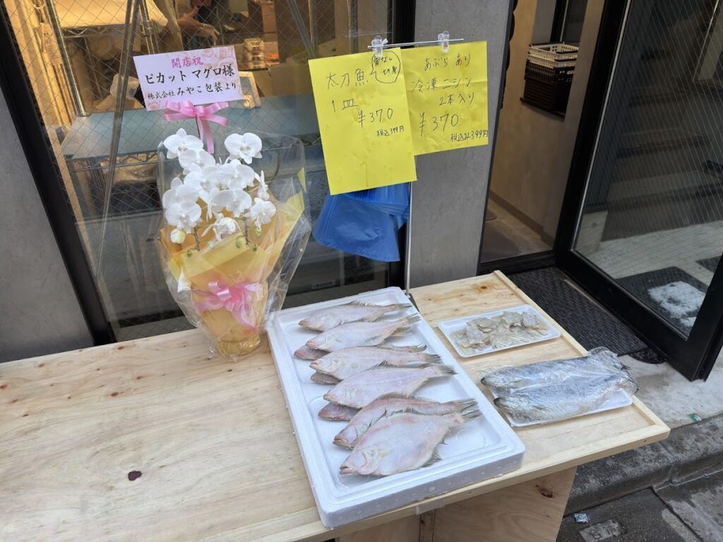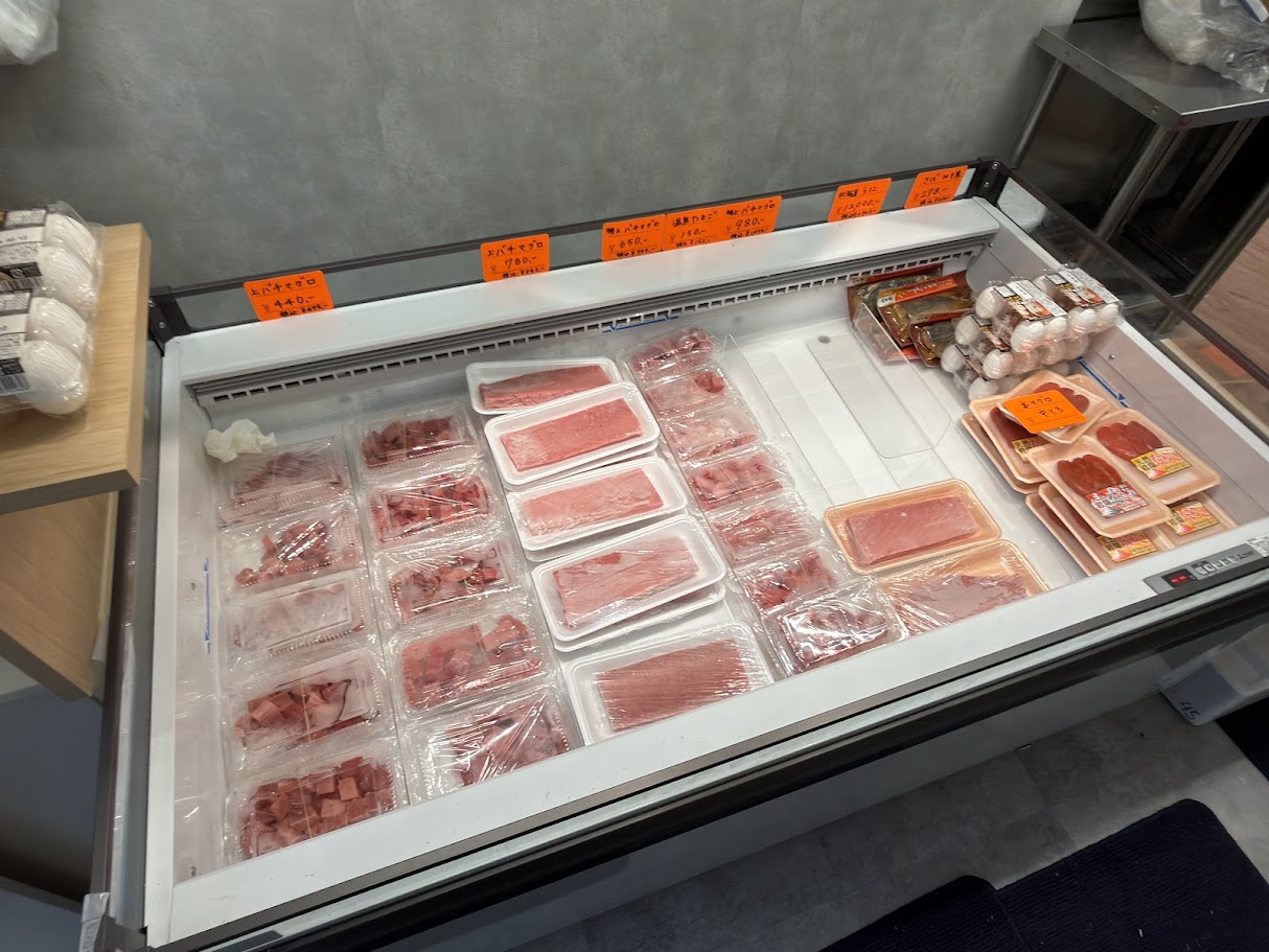 店内では、バチマグロのブツや柵、明太子や佃煮などが売られ、店頭では、丸魚や切り身が売られていました。