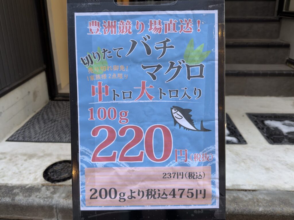 看板商品はバチマグロのブツで、100g220円!