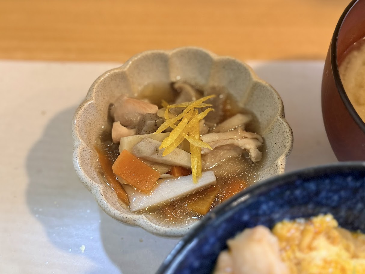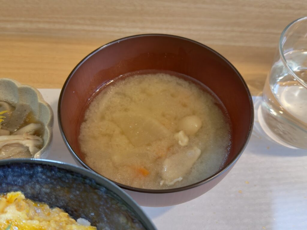 こちらが、思い出玉子と美桜鶏の親子丼(900円)。ランチは全品具沢山豚汁と小鉢が付いてきます。ご飯大盛り無料。