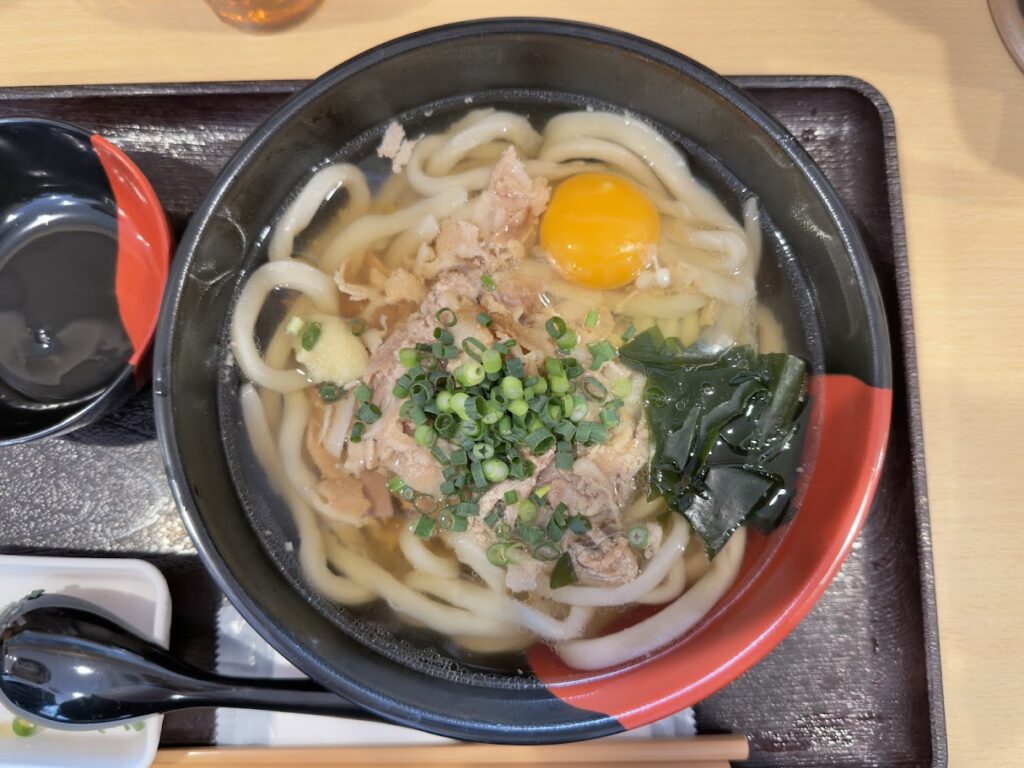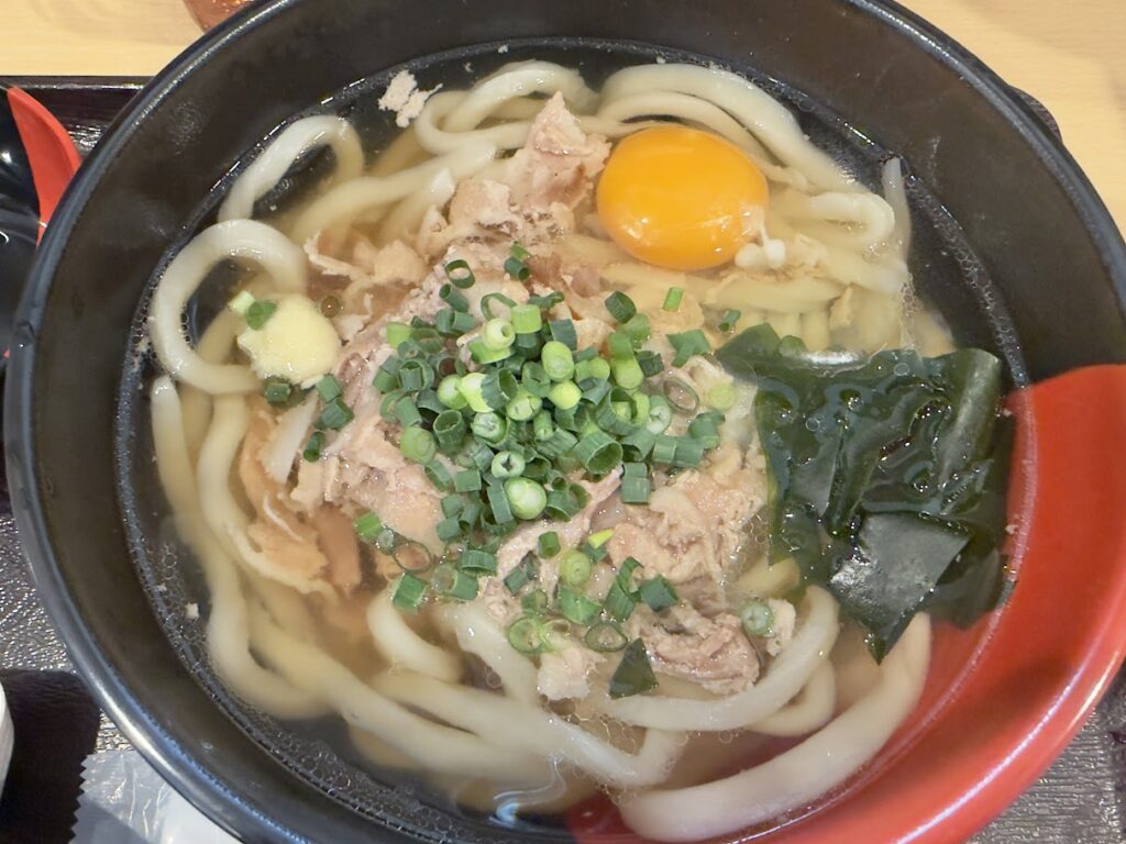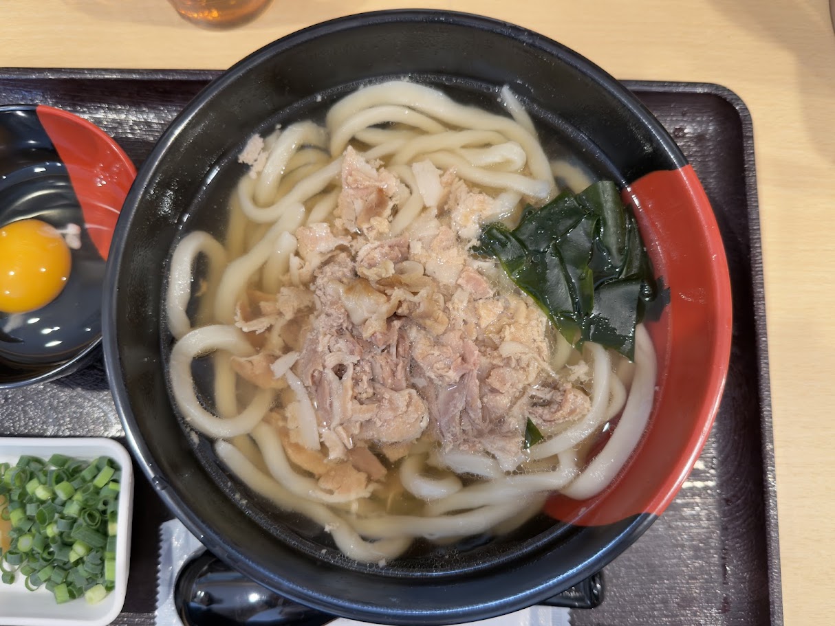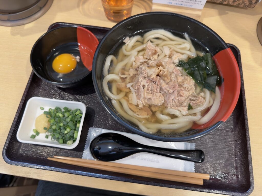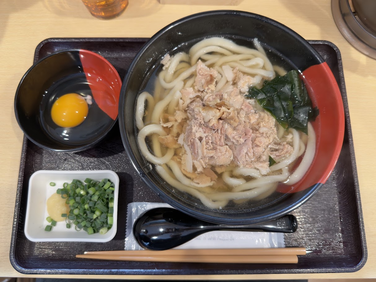看板丼の「肉うどん」をオーダー。トッピングに玉子を入れてみました。薬味のネギとしょうがは無料で多めにも出来ます。こちらはネギ多め。味付豚肉も滋味あふれるホロホロで良い感じ。