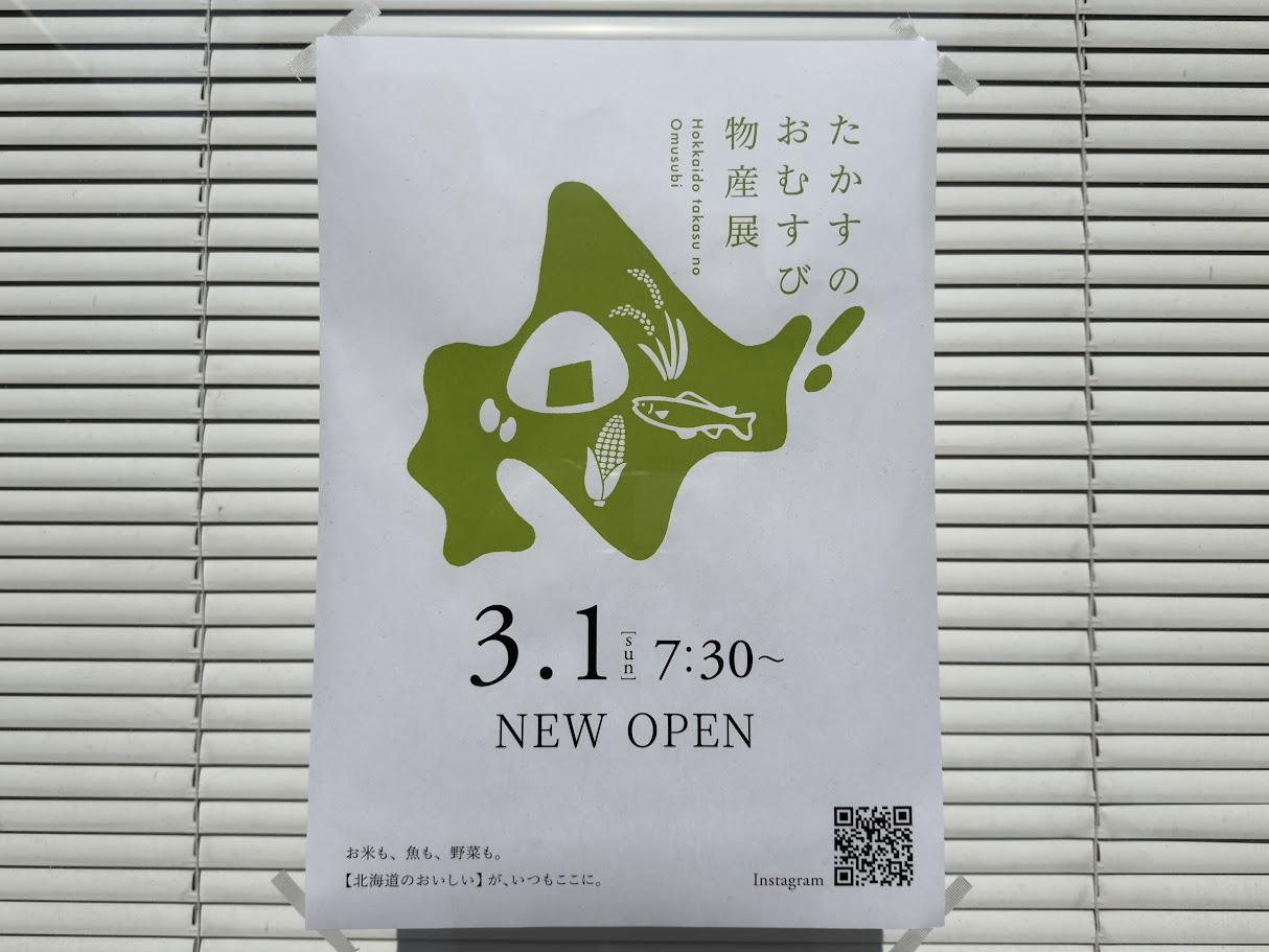 2026年3月1日(日)、東京都江東区東陽6-3-28に、北海道のゆめぴりかを使ったおむすび屋「たかすのおむすび物産展」がオープン予定です。