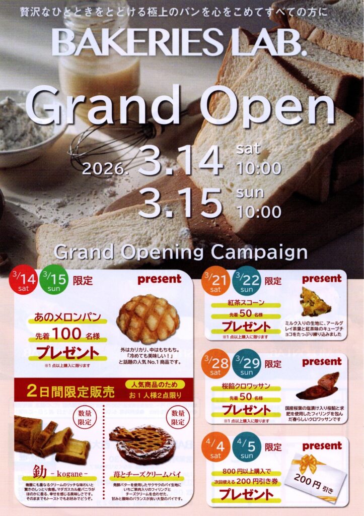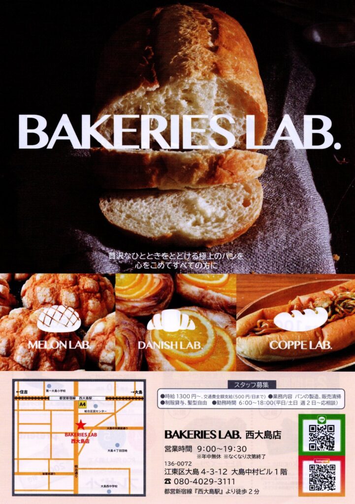 西大島駅近の明治通り沿いのパン屋さんのオープン日が3/14(土)に決まったよ。 NEWS 2026.03.11 2026年3月14日(土)、東京都江東区大島4-3-12に、ベーカリー「BAKERY’S LAB 西大島店」がオープン予定です。 西大島駅近の明治通り沿いのパン屋さんのオープン日が3/14(土)に決まったよ。 オープンキャンペーンで、外はカリカリ中はモチモチ冷めてもおいしい「あのメロンパン」100個プレゼント!限定販売品もあるよ! BAKERY’S LAB 西大島店(東京都江東区大島4-3-12) 西大島駅近の明治通り沿いのパン屋さんのオープン日が3/14(土)に決まったよ🥳🎉オープンキャンペーンで、外はカリカリ中はモチモチ冷めてもおいしい「あのメロンパン」🌕️100個プレゼント!限定販売品もあるよ!📍BAKERY’S LAB 西大島店(東京都江東区大島4-3-12) pic.twitter.com/46LvtRSwA9— 南砂一丁目 (@minamisuna1) March 11, 2026
