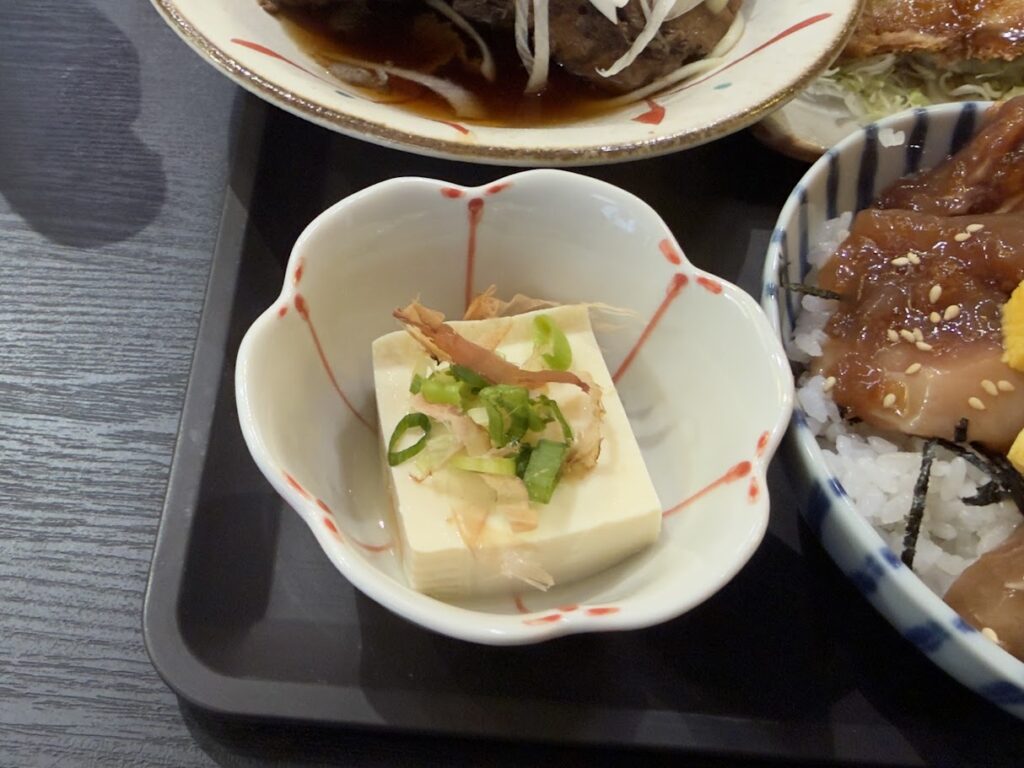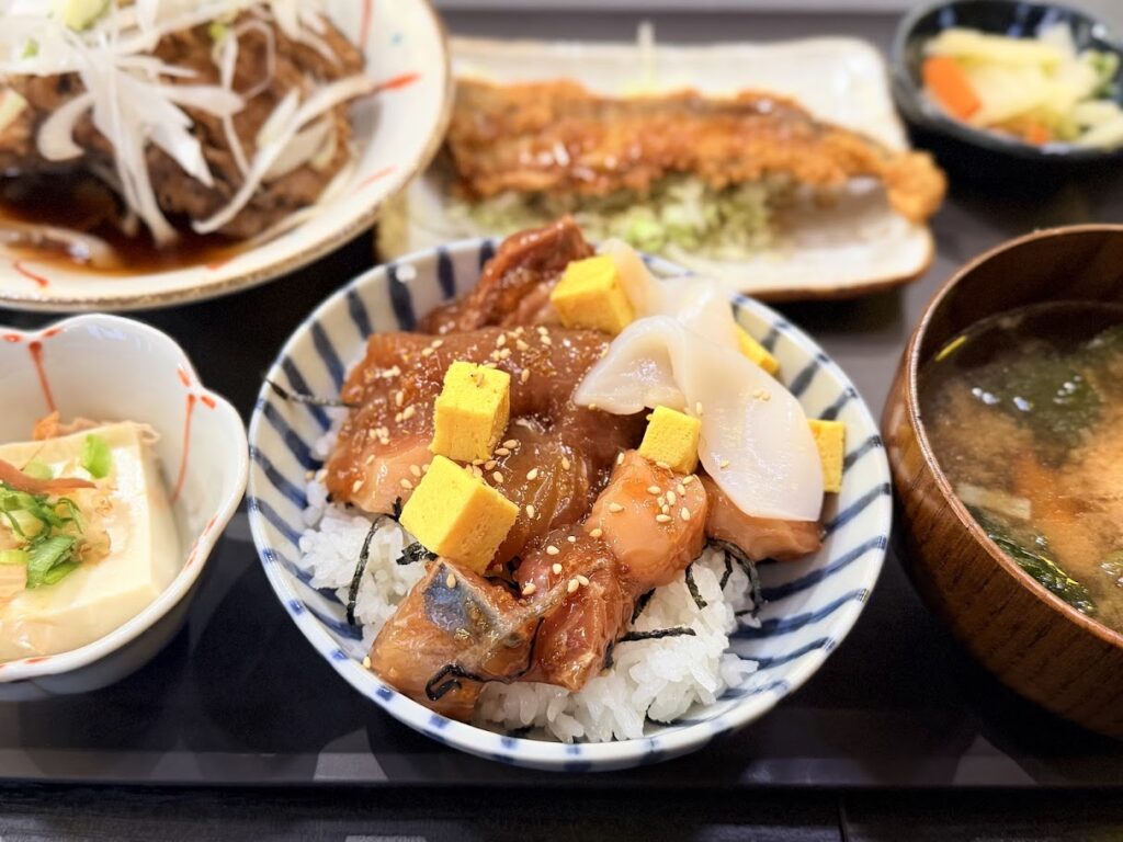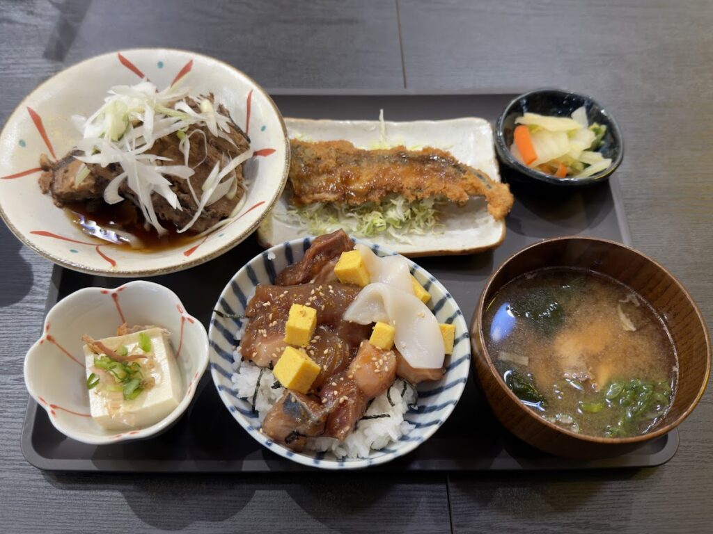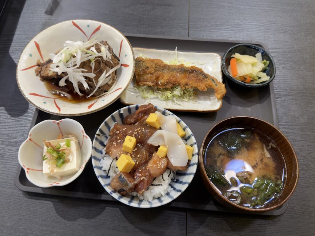 ランチは、40食限定で、今日の煮魚、今日の揚げ物、冷奴、漬物、バラちらし丼、味噌汁のセットです。