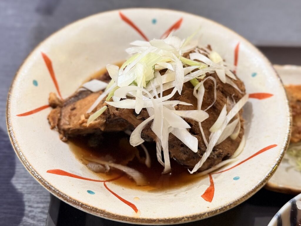 「今日の煮魚」は「ブリの煮付け」。大人の拳ぐらいの大きさのブリがゴロン。豪快です。