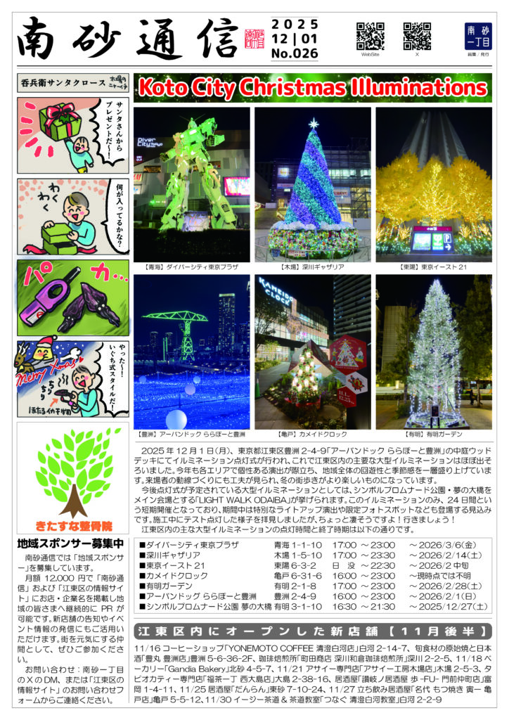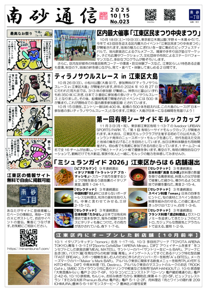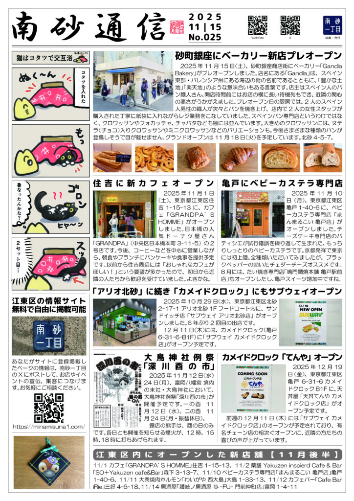 「南砂通信」とは 2024年11月1日(金)創刊。江東区内の「たのしい!」と「おいしい!」だけを掲載する、無料の江東区オンリーメディアです。毎月1日と15日、月2回発行。 編集・発行:南砂一丁目